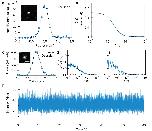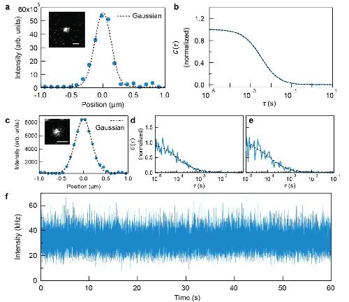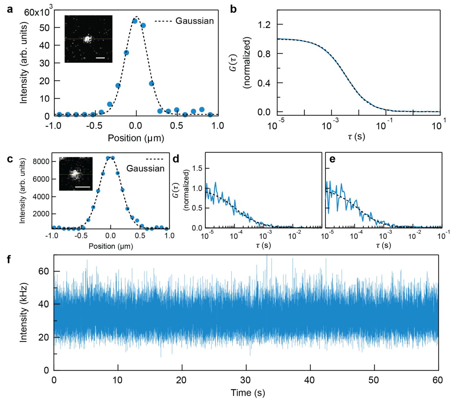 \begin{document}$$\delta I\left(t\right)=I\left(t\right)-\left\langle I\left(t\right)\right\rangle$$\end{document}δIt=It−It, where I(t) is the fluorescence intensity and the brackets denote time averages. The autocorrelation curve was fitted by an anomalous diffusion model (dashed line). In this example, the number of particles was 42, and the average intensity (shown in e) was 32 kHz, corresponding to a molecular brightness of 0.76 kHz/molecule. Source data are provided as a Source Data file. |