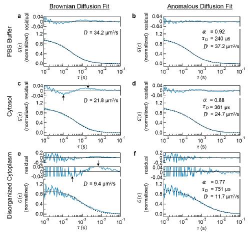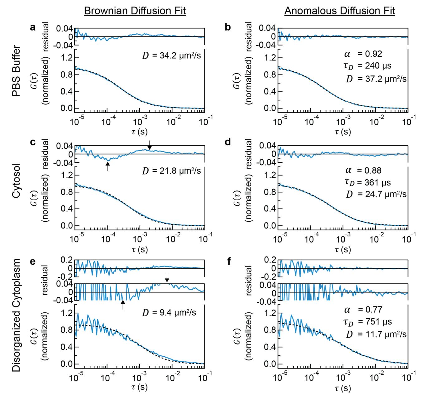 Supplementary Figure 3: Diffusion analysis of FCS autocorrelation functions. a, c, e, Fitting a Brownian model to data for BSA diffusion in PBS buffers, cytosolic extracts, and disordered cytoplasmic extracts. b, d, f, Fitting an anomalous diffusion model to the same data. Note that Brownian motion ideally yields 𝛼 = 1 even with anomalous diffusion fits (also see Supplementary Fig. 2b) |