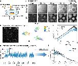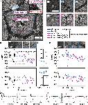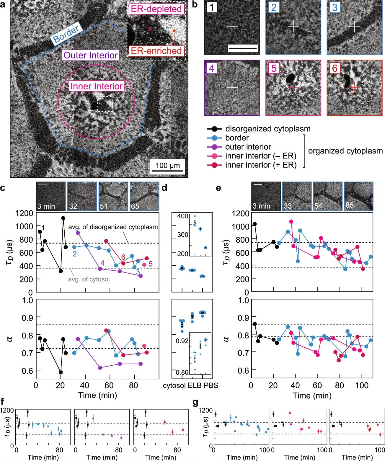 Figure 2. a, Spatial regions of self-organization (color-coded), classified by the ER morphology. The dark sphere near the center of the inner interior is the nuclei. The image was stitched from multiple confocal images. b Representative confocal images of FCS foci, which are marked by the crosshairs. The annotated numbers refer to snapshots taken prior to FCS measurements in c. c Tracing protein diffusion during self-organization by FCS. The plots show the characteristic diffusion times τD and the diffusion mode α obtained from fitting the FCS curves. Black and gray dashed lines correspond to averages from disordered cytoplasmic extracts (in this example, 740 µs, Deff = 11.9 µm2/s) and cytosolic extracts (360 µs, Deff = 24.7 µm2/s), respectively. d Benchmark measurements from cytosolic extracts and buffers. ELB, egg lysis buffer; PBS, Phosphate-buffered saline. Insets show zoom-in of the data. Each condition was measured five times; all data presented by error bars are mean ± SEM. n = 5 measurements of different positions in a sample. e, Biological repeat of c, prepared from a separate batch of eggs. f, g are isolated traces from c and e. Error bars, estimated errors (standard deviation) from curve fitting (each fitting was performed over n = 107 data points). Scale bars, 100 µm. Source data are provided as a Source Data file. |