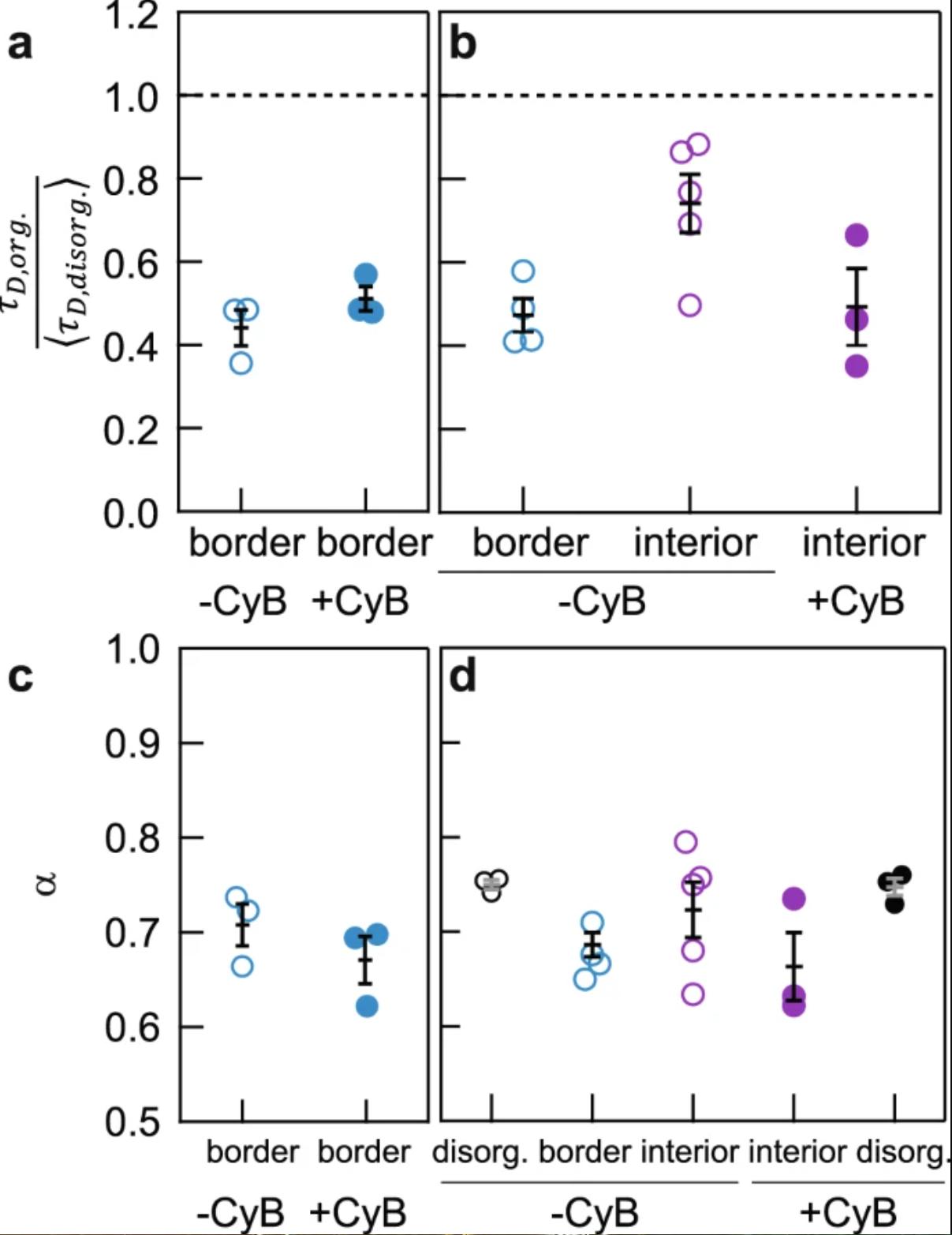 Figure 5. a, b Normalized diffusion times of BSA in actin-intact extracts, prepared without the addition of cytochalasin B (CyB). Note that the diffusion rate did not increase more during the self-organization of actin-intact extracts (open circles) than it did in actin-inhibited extracts (solid circles). The two panels are two independent experiments. c, d Degree of subdiffusion in actin-intact and actin-inhibited extracts. Data shown in panel c and d are from the same experiment shown in panel a and b, respectively. Error bars, SEM. n = {3, 3, 4, 5, 6; 3, 3, 3, 4, 5, 6, 3} measurements of different positions in an extract for data from left to right and top to bottom, respectively. Source data are provided as a Source Data file. |