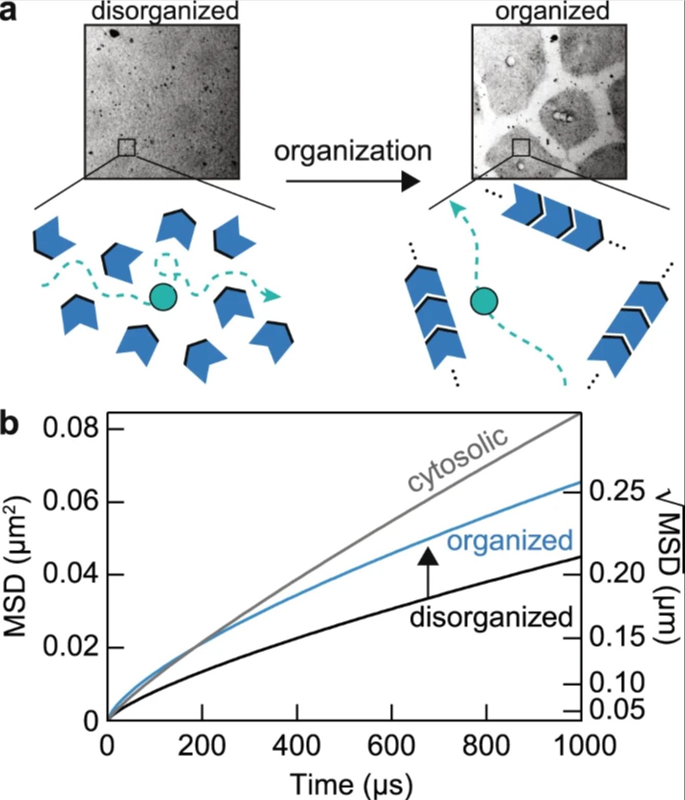Fig. 6. Organized cytoplasm optimizes short-range diffusion by reorganizing obstacle densities.a Schematic of the model: molecular and organelle reorganization optimizes molecular diffusion by creating longer mean free paths for diffusing molecules. The green object represents a protein of interest diffusing in the cytoplasm; the blue objects represent obstacles in the cytoplasm, such as organelles, cytoskeleton elements, and macromolecular complexes. In this model, proteins in organized cytoplasm remain free to diffuse in all directions. b Diffusion effects of molecular reorganization illustrated with mean squared displacement, MSD (t) = Γtα. The parameters {Γ, α} estimated for disorganized cytoplasm, organized cytoplasm and the cytosol are {8, 0.75}, {8.25, 0.70}, and {30, 0.85}, respectively. Note that based on the tradeoff between diffusion times and subdiffusivity in the organizing cytoplasm (Fig. 3a), we have assumed that the acceleration of protein movements over these distance scales comes at a cost of slower dynamics over longer distance scales. We also limit the comparison around the length scale of FCS measurements (~0.1–0.5 µm) since protein dynamics may show distinct characteristics at shorter and longer distance scales. Source data are provided as a Source Data file. |