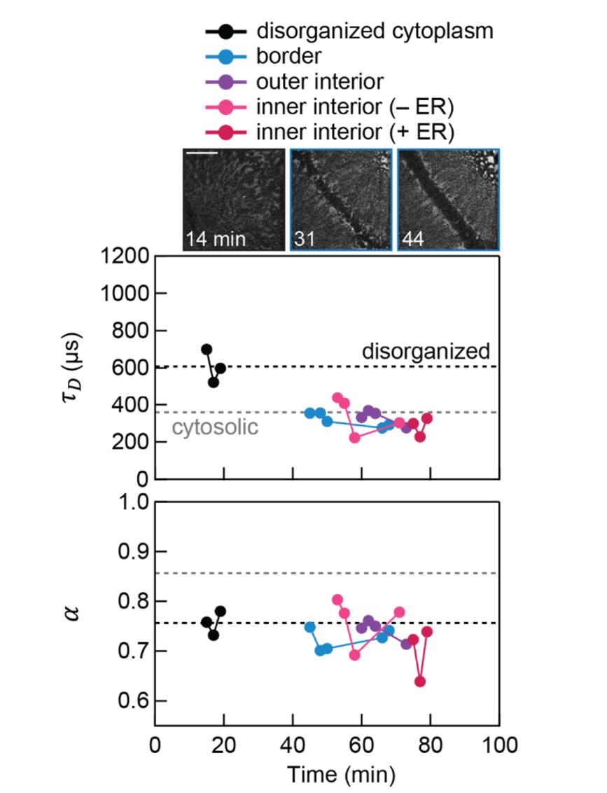 A biological repeat of Fig. 2 experiments. In this sample, the cytoplasm formed organized structures earlier than the other experiments; as a result, the diffusion changes between the