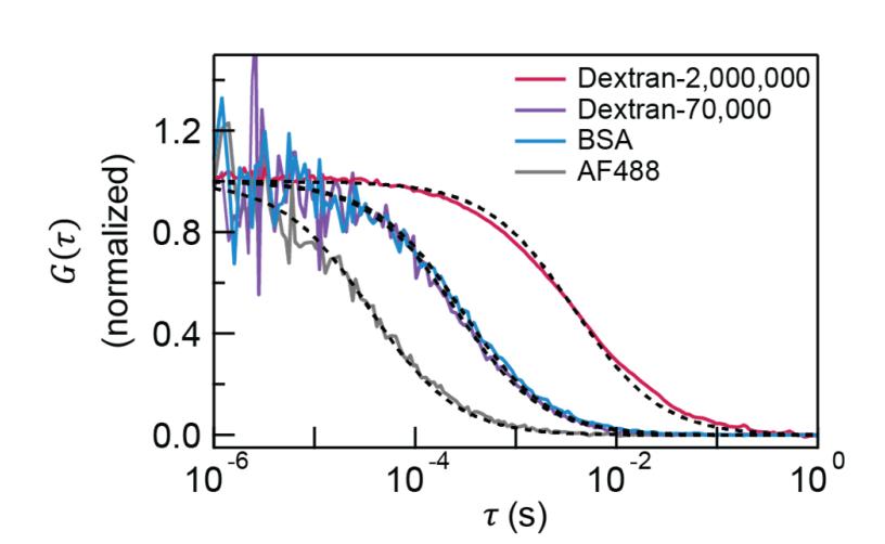 Supplementary Figure 7: Size estimation of probes used in this study. The relative sizes of the diffusion probes were measured in PBS buffers using FCS. The autocorrelation functions were fitted by a Brownian model (𝜶 = 𝟏) (dashed curves). The diffusion times yield the relative Stokes radii by the Stokes-Einstein equation, 𝑫 ∝ 𝟏/𝑹. The relative Stokes radii for AF488, BSA, dextran-70K, and dextran-2M are 0.12, 1.00, 0.88, and 13.3, respectively. The relative values were converted to absolute lengths by taking the Stokes radius of BSA to be 3.5 nm. As a note, the polydisperse nature of dextran-2M could also be effectively fitted by the anomalous diffusion model, though the diffusion was expected to be Brownian11. Nevertheless,