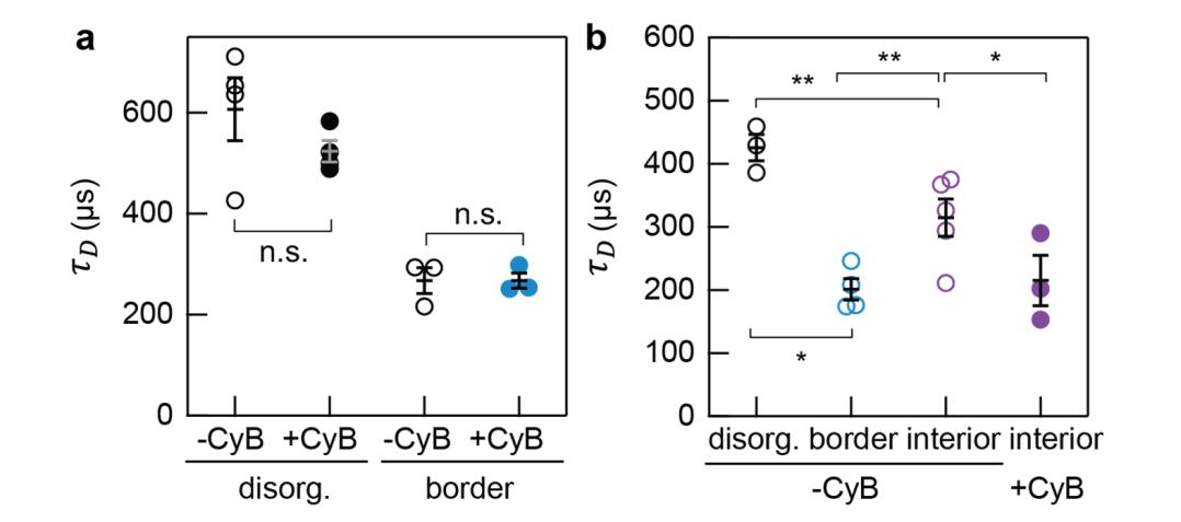 Figure 5. a, b Normalized diffusion times of BSA in actin-intact extracts, prepared without the addition of cytochalasin B (CyB). Note that the diffusion rate did not increase more during the self-organization of actin-intact extracts (open circles) than it did in actin-inhibited extracts (solid circles). The two panels are two independent experiments. c, d Degree of subdiffusion in actin-intact and actin-inhibited extracts. Data shown in panel c and d are from the same experiment shown in panel a and b, respectively. Error bars, SEM. n = {3, 3, 4, 5, 6; 3, 3, 3, 4, 5, 6, 3} measurements of different positions in an extract for data from left to right and top to bottom, respectively. Source data are provided as a Source Data file. |