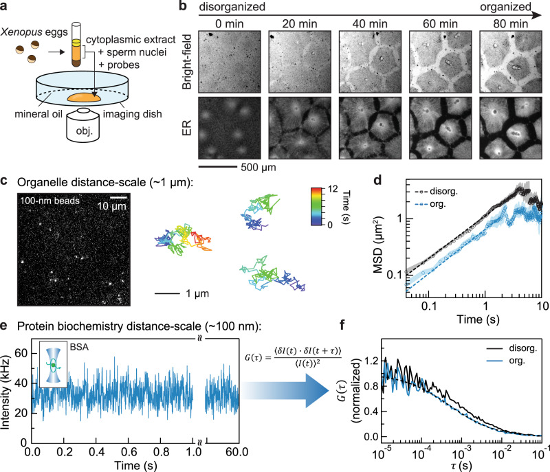 Fig. 1. Resolving molecular diffusion in cytoplasmic extracts.a Schematic of the experimental setup used in this study: Xenopus laevis eggs were fractionated to obtain the undiluted cytoplasmic extract, which was then deposited on the surface of an imaging dish and covered with mineral oil. b Time-lapse images of the self-organizing cytoplasm, visualized with 1 µM ER-Tracker Red dye. c Image (left) of dilute 100-nm (diameter) microspheres in extracts. Trajectories (right) are examples from single-particle tracking in the organized cytoplasm (interior regions in Fig. 2a). The relative positions between the three tracked particles were adjusted for display (they were tens of microns apart in the extracts). d Ensemble mean squared displacement (MSD) analysis derived from the single-particle tracking. Shaded area, standard error of the mean (SEM). Dashed lines are fitting to \documentclass[12pt]{minimal}
