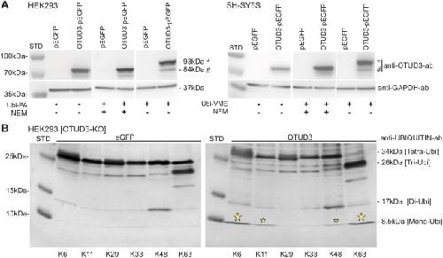 Supplementary figure 1: OTUD3 catalytic activity in SH-SY5Y. (A) The activity of OTUD3 cysteine protease function was measured upon transfection with OTUD3-GFP of SH-SY5Y cell lysates. Cell lysates were incubated in the presence or absence of 1μg ubiquitin-propargylamide protein (Ubi-PA) or ubiquitin-vinylmethylester (Ubi-VME). NEM was added to block protease activity to control specificity. An anti-GAPDH blot is shown as loading control. (B) Raw data. Red dotted lines indicate parts (lane 1+2) of the Western blots that are shown in figure 3 and supplementary figure 1A. Lane 5 represents the potentially catalytic dead variant of OTUD3 C76S. which induced cell death within 24h after transfection. Lane 3+4 are OTUD3 mutant variants that are not referenced in the actual manuscript. Lane 1: Transfected with plasmid pEGFP, lane 2: OTUD3- pEGFP; lane 3: OTUD3- pEGFP-mut1; lane 4: OTUD3- pEGFP-mut2; lane 5: OTUD3- pEGFP-C76S. |
