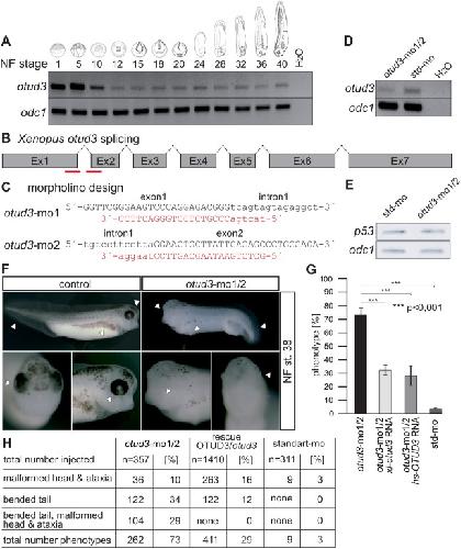 Fig. 4. Suppression of otud3 function interferes with normal anterior development in Xenopus laevis embryos. A) Semi-quantitative RT-PCR revealed high maternal expression of otud3.S and otud3.L. Low levels of otud3 are maintained during consecutive stages of development following gastrulation (NF 12). To monitor RNA input, odc1 expression was analyzed. B) Schematic representation of exon-intron structures of Xenopus laevis otud3 pre-mRNA. Red lines indicate otud3-morpholino1 (otud3-mo1) and otud3-morpholino2 (otud3-mo2) target sites. C) Target sequence of Xenopus laevis otud3 pre-mRNA (black) with corresponding antisense oligonucleotide sequence of otud3-mo1 and otud3-mo2 (red). The PCR primer and morpholino binding sites are conserved in otud3.S and otud3.L. D) Injection of otud3-mo1/2 at the 2-cell stage led to a strong decrease in otud3 transcript level in swimming tadpoles (NF stage 36) compared to standard morpholino (std-mo) as shown by semi-quantitative RT-PCR. E) To exclude off-target effects of otud3-mo1/2 the level of p53 expression was compared to mock (std-mo) injected embryos by RT-PCR. F) Injection of otud3-mo1/2 led to a pleiotropic phenotype including bent tail, malformed head and eyes, reduced pigmentation, and ataxia (NF stage 38;) compared to mock injected controls. G) Statistical evaluation of morphant phenotypes from three independent experiments (total of 300–400 embryos per experiment). 73 % of otud3-mo1/2 injected embryos showed the morphant phenotype at tadpole stage (black). Co-injection with synthetically capped Xenopus otud3 RNA (otud3-mo1/2 + otud3 RNA; light gray) or synthetically capped human OTUD3 RNA (otud3-mo1/2 + OTUD3 RNA; gray) clearly demonstrate rescue of the morphant phenotype (by approximately 60 %). Only 3 % of control embryos injected with std-mo (dark gray) developed abnormally. The frequencies of the morphant phenotypes are significant (***, p < 0.001; χ2-test). H) A table summarizes the proportion of otud3 morphant phenotypes (otud3-mo1/2; left) and those rescued by OTUD3 RNA co-injection (rescue otud3; right) compared to mock-injections (std-mo). Commonly observed phenotypes include malformed head associated with ataxia (34 %) or bent tails (29 %). The most severely affected morphants showed both phenotypes (10 %) which was not observed under rescue conditions. (For interpretation of the references to color in this figure legend, the reader is referred to the web version of this article.) |