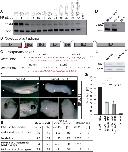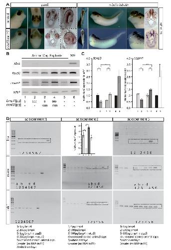 Supplementary figure 3: Suppression of otud3 function interfered with neurogenesis and BMP-signaling. A) Embryos injected with 2.5pmol otud3 morpholino developed smaller heads with smaller and dysplastic eyes, accompanied by a generally non-regular expression of pax6 and n-beta-tubulin within remaining neural territories. B-D) Basal and bmp4-induced expression of neural marker genes in animal cap explants. A) Semi-quantitative RT-PCR analysis of relative ncam1 expression after injection of synthetic RNA encoding bmp4 and otud3. Expression of xbra was monitored to exclude mesoderm induction. RNA input was controlled by analyzing odc1 expression. C) Quantification of relative ncam1 and foxd3 expression by sqRT-PCR. Increasing doses of bmp4 RNA led to decreased expression of ncam1 (1, 2). Co-injection of otud3 RNA opposed bmp4 effects (3, 4). Untreated caps (5) and whole embryos (WE) were included as controls. D) Raw data. The effect was followed in three independent experiments. Each set showed a clear suppression of bmp4 signaling upon otud3 co-expression as monitored by the induction of the neural marker gene ncam. Comparable bands (a-d) were analyzed by ImageJ and evaluated using TTEST (Excel). In two experiments bra expression was analyzed to exclude an indirect effect on neural induction by mesoderm formation. Shown are the original images taken with a BioRad2000. Bands outside the spotted rectangle represent unrelated controls. The only adjustment was to inverse the color for a better illustration. The calculation revealed significance (2-sided, heteroskedastic; <0,05=*, <0,01=**; <0,001=***). |