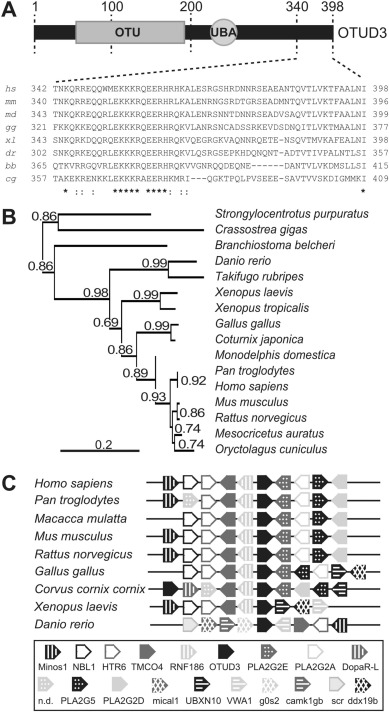 Fig. 1. OTUD3 is highly conserved in evolution. A) OTUD3 protein contains an OTU domain bearing a putative cysteine protease and an UBA interaction site. Of note is a characteristic isoleucine forming the last amino acid of the protein. B) Phylogenetic tree of putative full-length OTUD3 selected from the animal kingdom based on maximum likelihood and bootstrap analysis. The branch length is proportional to the number of substitutions per site. The numbers next to the nodes are bootstrap support values. Branch lengths are scaled based on the estimated divergence, with the scale bar at the bottom of the phylogram indicating the evolutionary distance. There is a 20 % relative divergence observed over time. Notably, mammals, birds, fishes, and amphibians show a close phylogenetic lineage. C) Synteny analysis of OTUD3/otud3: The location and orientation of OTUD3/otud3 in the respective genomes is conserved. Each arrow stands for a single gene while the arrowhead indicates the direction of the open reading frame (ORF). OTUD3/otud3 (black arrow) is present in all analyzed species. In all species except zebrafish, up- and downstream OTUD3/otud3 is flanked by the same genes. Abbreviations: GenBank Accession numbers, GBA-no.; bb, Branchiostoma belcheri (lancelets), GBA-no. XM_019782191; cg, Crassostrea gigas (Pacific oyster), GBA-no. XM_011447637; Coturnix japonica (Japanese quail), GBA-no. XM_015882304; dr, Danio rerio (zebrafish), GBA-no. NM_212922; gg, Gallus gallus (domestic chicken), GBA-no. XM_424363; hs, Homo sapiens, GBA-no. NM_015207; Mesocricetus auratus (golden hamster), GBA-no. XM_005081047; md, Monodelphis domestica (opossum), GBA-no. XM_001377743; mm, Mus musculus (house mouse), GBA-no. NM_028453; Oryctolagus cuniculus (common rabbit), GBA-no. XM_002716005; Pan troglodytes (common chimpanzee), GBA-no. XM_513073; Rattus norvegicus (common rat), GBA-no. NM_001191983; sp, Strongylocentrotus purpuratus (purple sea urchin), GBA-no. XM_001191596; Takifugo rubripes (pufferfish), GBA-no. XM_003962965; xl, Xenopus laevis (African claw frog), GBA-no. NM_001095317; xt, Xenopus tropicalis (Western claw frog), GBA-no. NM_001005056. |
