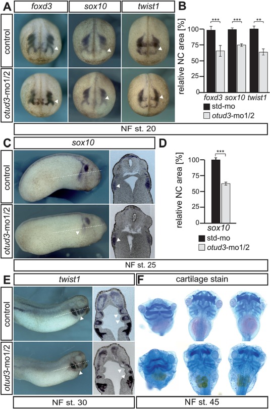 Fig. 5. OTUD3 function is required for proper cranial neural crest specification. A) Whole-mount in situ hybridization (Wmish) of control embryos and otud3 morphants at NF stage 20. Expression of neural crest (NC) specification genes: foxd3, sox10, and twist1 were followed in cranial neural crest cells (NCCs) of NF stage 20 embryos. Loss of otud3 function led to smaller areas of foxd3, twist1, and sox10 expression. Quantification of foxd3, sox10, and twist1 expression in cranial neural crest was carried out with ImageJ. Stained NC areas of control embryos as shown in were measured and set to 100 % (std-mo, black). Compared to controls, he areas of expression in otud3 morphants (otud3-mo1/2, gray) are significantly reduced for all marker genes analyzed (**p < 0.01, ***p < 0.001; Student's t-test; N = 8–11). B) Using sox10 to mark the hyoid and branchial neural crest cell streams in young tadpoles (NF stage 25) which appear altered in otud3 morphants compared to controls. White dotted lines indicate the plane of the sections. White triangles indicate neural crest cells. Quantification of relative sox10 RNA expression detected by Wmish at NF stage 25. Relative NC areas were measured using the ImageJ software. Control embryos (std-mo, black) are normalized to 100 %. In otud3 morphants (otud3-mo1/2, gray) sox10 expression is strongly suppressed. Frequencies are highly significant (**p < 0.01, ***p < 0.001; Student's t-test; N = 9–10). C) Wmish of control embryos and otud3 morphants at late tailbud stage (NF stage 30). White dotted lines indicate the plane of sections. NCCs migrating into the mandibular, hyoid, and anterior and posterior branchial streams were marked by twist1. otud3 morphants exhibit shortened branchial and mandibular streams and the hyoid stream is markedly reduced. D) Analysis of the formation of head cartilage by alcian blue cartilage staining in swimming tadpoles. At NF stage 45, Meckels cartilage (ME), ceratohyal cartilage (CE), branchial cartilage (BR), and basihyal cartilage (BA) developed normally in control embryos. otud3 morphants exhibit compressed and shorted heads with deeper embedded eyes and an edematous body. (For interpretation of the references to color in this figure legend, the reader is referred to the web version of this article.) |