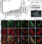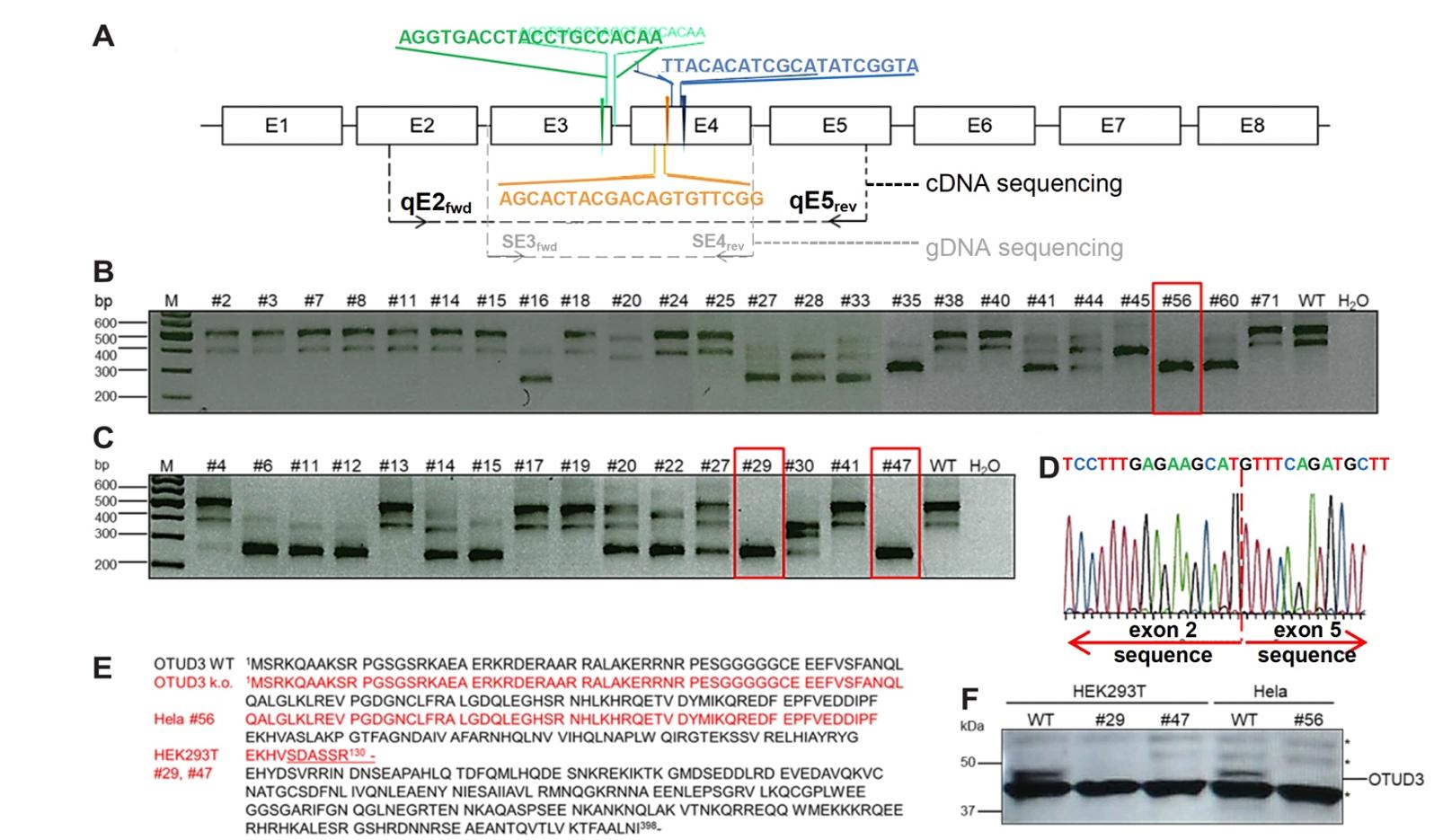 Supplementary figure 2: Screening and identification of OTUD3-KO clones. A) Scheme of OTUD3 exons and introns. Location and sequences of all three guide RNAs are shown in green, dark blue and orange. DSB sites induced by Cas9 are shown as wedges. Primers used for gDNA, and cDNA sequencing and locations are as indicated. B) PCR products of 24 potential HeLa and C) 16 HEK293T OTUD3-KO clones were loaded on 2% agarose gels. PCR products were spanning exon 2 to exon 5 of OTUD3 compared to wildtype cells. HeLa clone #56 and HEK293T clones #29 and #47 showed a single PCR fragment suggesting deletion of exon 3 and 4. D) Representative Sanger sequence of HeLa clone #56 obtained from cDNA sequencing. On cDNA level exon 2 and exon 5 sequences are adjacent and exons 3 and 4 are missing. Same results were obtained for HEK293T clones #29 and #47. E) Comparison of human OTUD3 wildtype protein sequence (black) and translated cDNA sequence of KO clones (red). Note, a stop codon is introduced at position 131 in KO clones. F) Western blot analyses of OTUD3-KO clones. All OTUD3-KO clones analyzed showed no presence of OTUD3 protein. The star (*) marks unspecific bands. 20 μg of total cell lysates were loaded on 14% SDS PA gels. Western Blot was performed applying anti-OTUD3 antibody (1:250, Novus Biologicals). |