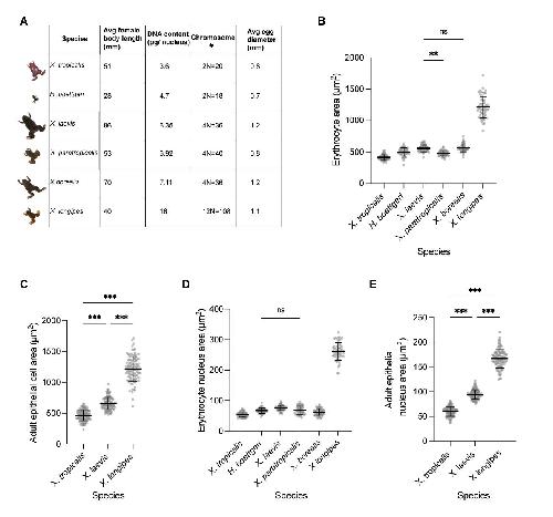 Figure S2. Measurements of cells and nuclei in adult Pipid frog species. Related to Figure 2 (A)Characteristics of frog species used for erythrocyte measurements. (B)Cross-sectional cell area of erythrocytes from adult frog species described in S1A. All P-values between species are <0.001 (not shown), except where indicated as not significant (p>0.05, ns) or (p<0.005,**) determined by two-tailed t-test. (C)Cross-sectional cell area of epithelial cells from adult X. tropicalis, X. longipes, and X.laevis. (D)Cross-sectional nucleus area of erythrocytes from adult frog species described in S1A. All p-values between species are <0.001 (not shown), except where indicated as not significant (ns) determined by two-tailed t-test. (E)Cross-sectional nucleus area of epithelial cells from adult X. tropicalis, X. longipes, and X. laevis. For plots in B-E, thick line in the middle of each set of points = mean, error bars = +/- std dev. ***p<0.001. For erythrocytes, n≥50 cells and nuclei were measured in each species. For epithelia, n≥100 cells and nuclei were measured in each species.