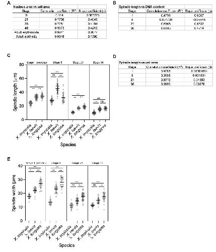 Figure S4. Spindle length and width in X. tropicalis, X. laevis, and X. longipes embryos. Related to Figure 4 (A) Correlation and slope coefficients of nucleus area vs cell area from linear trendlines in Fig. 4A. Correlation coefficients for linear trendlines (R2) were calculated from the Pearson’s Correlation Coefficient (R). (B) Correlation and slope coefficients of spindle length vs genome size from linear trendlines in Fig. 4D. (C) Spindle length (measured as pole-to-pole distance) through development including Stage 1 (unfertilized meiotic). Thick line in the middle of each set of points=mean. Error bars= +/- std dev. ***p<0.001, ns= not significant, determined by two-tailed t-test. n≥34 spindles from >3 eggs/embryos from ≥3 clutches measured for each species per stage (D) Correlation and slope coefficients of spindle length vs cell area from linear trendlines in Fig. 4F. n ≥20 metaphase plates from ≥3 clutches measured for each species per stage. (E) Spindle width (measured as metaphase plate length) through development including Stage 1 (meiosis II). Thick line in the middle of each set of points=mean. Error bars= +/- std dev. ***p<0.001, determined by two-tailed t-test.