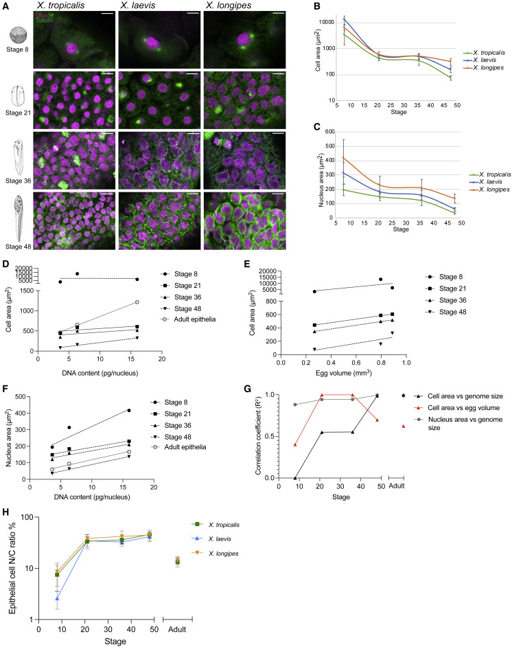 (A) Images of cells and nuclei in X. tropicalis, X. laevis, and X. longipes embryos, stages 8–48. Scale bars, 15 μm. Histone H3 staining indicates DNA.