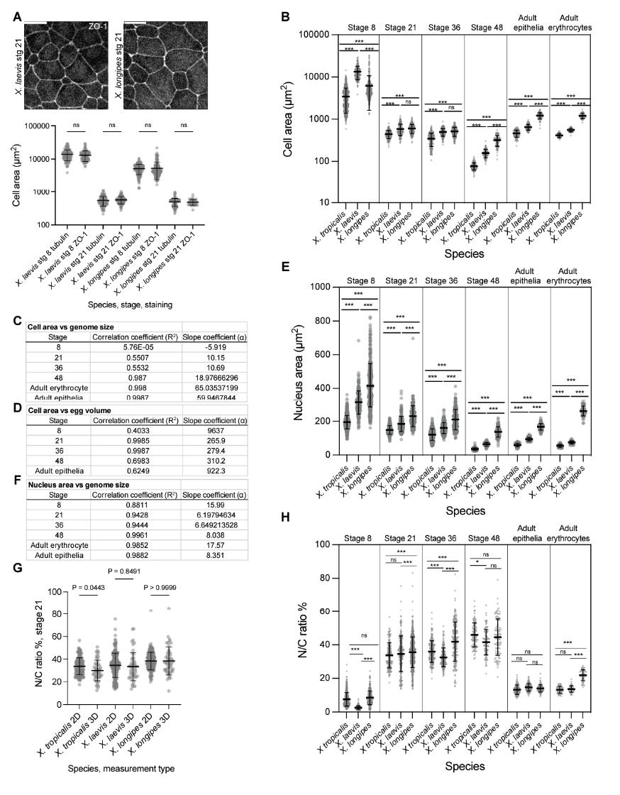 Figure S3. Measurement of cells, nuclei and N/C ratios in Xenopus embryos Related to Figures 2 and 3 (A)Comparison of ZO-1 (Zonula Occludens, tight junction) and tubulin staining in X. laevis and X. longipes embryos to measure cross-sectional area of cells shows that they produce statistically indistinguishable data. Scale bar, 15 µm. (B)Cross-sectional area of cells from X. laevis, X. tropicalis, and X. longipes embryos and adults measured using tubulin staining. (C)Correlation and slope coefficients of cell area vs genome size from linear trendlines in Fig. 3D. Correlation coefficients for linear trendlines (R2) were calculated from the Pearson’s Correlation Coefficient (R). (D)Correlation and slope coefficients of cell area vs egg volume from linear trendlines in Fig. 3E. Correlation coefficients for linear trendlines (R2) were calculated from the Pearson’s Correlation Coefficient (R). (E)Cross-sectional area of nuclei from X. laevis, X. tropicalis, and X. longipes embryos and adults. (F)Correlation and slope coefficients of nucleus area vs genome size from linear trendlines in Fig. 3C. Slope coefficients were statistically similar between stage 21 and 36 (p=0.6134) and between stage 48 and adult epithelia (p=0.2344). (G)Comparison of Nuclear/Cytoplasmic (N/C) volume ratios calculated from 2dimensional (2D) cross-sectional area measurements vs. 3-dimensional (3D) reconstructions of confocal Z-stacks in stage 21 X. tropicalis, X. laevis, and X. longipes embryos. n≥50 skin epithelial cells or nuclei from ≥3 embryos from ≥3 separate clutches were measured per stage for each species. (H)N/C volume ratios in X. tropicalis, X. laevis, and X. longipes, embryos and adults, calculated from cross-sectional area measurements in 3B-C. For plots in A, B, and E, at stage 8, cells near the surface of the embryo from both animal and vegetal polls were measured. From stage 21-48, skin epithelial cells were measured. n≥100 cells or nuclei from ≥3 embryos or adults from ≥3 separate clutches were measured per stage for each species. For all plots, thick line in the middle of each set of points=mean. error bars= +/- std dev. ***p<0.001, *p<0.05, and ns= not significant, determined by two-tailed t-test.