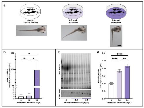 mRNA (b) and Prdm12 protein (c,d) levels were assessed in comparison to vehicle controls (0 mg/L). Both concentrations of the pesticide caused noticeable gross morphological alterations in tadpole axes with more severely bent phenotypes observed in the higher concentration (a). Malathion at 0.5 mg/L did not significantly alter