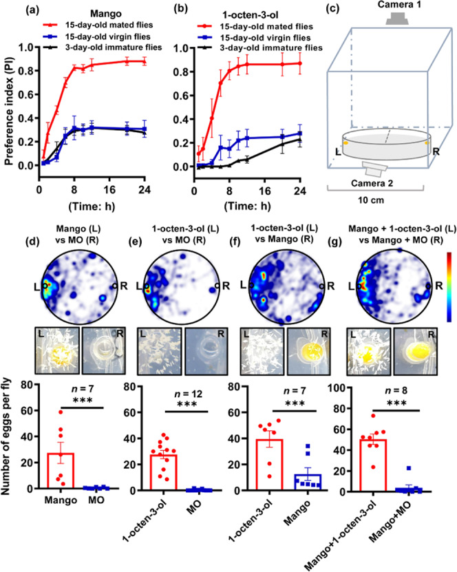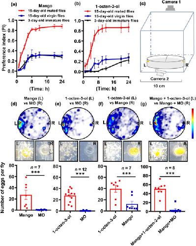 Fig. 1. Olfactory preference and oviposition behavior in B. dorsalis induced by mango and 1-octen-3-ol.a The preference index of mango flesh for 3-day-old immature females, 15-day-old virgin females and 15-day-old mated females. b The preference index of 1-octen-3-ol for 3-day-old immature females, 15-day-old virgin females, and 15-day-old mated females. c Schematic diagram of the experimental setup for oviposition behavior assays. d–g Oviposition behavior induced by mango and/or 1-octen-3-ol. The heat map is based on fly tracks monitored using EnthoVision XT software. The color scheme represents the density of tracks and time spent of eight females, with red indicating the highest density. The images show the extent of oviposition after 24 h. The histograms show the average number of eggs laid by each female. Data are means ± SE of n ≥ 7 biological replicates. Statistical significance was determined using Student’s t-test (***p < 0.001). d Mango flesh vs MO. e 1-octen-3-ol vs MO. f Mango flesh vs 1-octen-3-ol. g Mango flesh + 1-octen-3-ol vs mango flesh + MO.