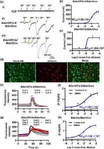 Xenopus oocytes were injected with the appropriate constructs and stimulated with 1-octen-3-ol at different concentrations. The oocytes were injected with (i) water as a control, (ii) cRNA of BdorOR7a-6/BdorOrco, (iii) cRNA of BdorOR13a/BdorOrco. b Dose-response curve of BdorOR7a-6 to 1-octen-3-ol. EC50 = 1.05 × 10−4 M. c Dose-response curve of BdorOR13a to 1-octen-3-ol. EC50 = 1.268 × 10−6 M. Symbols show the current responses from the BdorOR/BdorOrco complex presented as means ± SE (n = 8). The dose–response curves were fitted using GraphPad 8.0. d–h Responses to 1-octen-3-ol of HEK 293 cells co-expressing BdorOR7a-6/BdorOrco or BdorOR13a/BdorOrco. d Fluorescence images of HEK 293 cells incubated with Fluo4-AM and transfected with the candidate OR genes. Fluo4-AM was used to indicate the fluorescence change (ΔF) over time, and mCherry was used as the reporter to observe the successfully transfected cells. The proportional scale is 50 μm. e Change in fluorescence intensity of cells expressing BdorOR7a-6/BdorOrco following stimulation with 10−4 M of 1-octen-3-ol. f Dose–response curve of BdorOR7a-6 to 1-octen-3-ol. EC50 = 1.561 × 10−5 M. g Change of fluorescence intensity of cells expressing BdorOR13a/BdorOrco following stimulation with 10−4 M of 1-octen-3-ol. h Dose–response curve of BdorOR13a to 1-octen-3-ol. EC50 = 1.128 × 10−5 M.