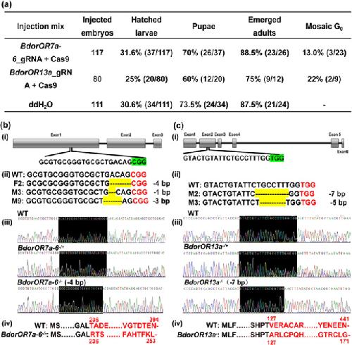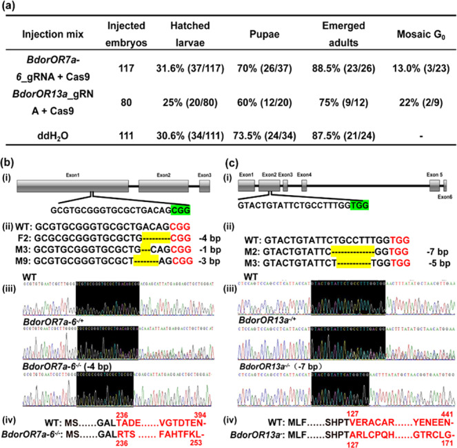 Fig. 3. CRISPR/Cas9 mutagenesis of BdorOR7a-6 and BdorOR13a.a Rates of survival and mutagenesis after microinjection. b The target region of BdorOR7a-6. (i) Gene structure of BdorOR7a-6 based on the genome sequence. Exons are shown as gray boxes and introns as lines. The gRNA target in the first exon contains a 20-nt guide sequence and the adjacent CGG highlighted in green is the protospacer adjacent motif (PAM). (ii) The genotypes of G0 mutants were determined by TA cloning and Sanger sequencing (deletions are shown as dashes highlighted in yellow). The identifier assigned to the mosaic G0 flies is shown in the front of each sequence, and the number of the deleted nucleotides is shown after each sequence. (iii) Sanger sequencing traces for WT, BdorOR7a-6−/+, and BdorOR7a-6−/− flies. The black region is the gRNA target site. (iv) Predicted protein sequences of the BdorOR7a-6 WT and mutant (−4 bp) alleles. c The target region of BdorOR13a, with (i–iv) indicating the same details as provided for above the BdorOR7a-6 mutants.
