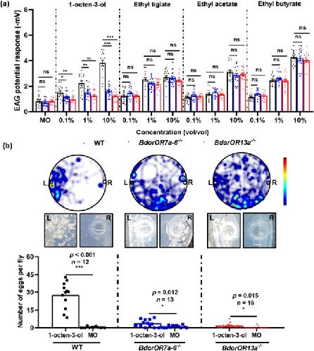 Fig. 4. The phenotypes of BdorOR7a-6−/− and BdorOR13a−/− mutants.a EAG responses of WT, BdorOR7a-6−/− and BdorOR13a−/− mutants to different concentrations of 1-octen-3-ol and other volatiles. Data are means ± SE (n = 15–20). Statistical significance was determined using Student’ s t-test (*p < 0.05, **p < 0.01, ***p < 0.001). b Oviposition behavior induced by 1-octen-3-ol in WT and mutant females. The heat map shows the density of tracks and time spent of eight females, with red indicating the highest density. The images show the extent of oviposition after 24 h, and the histogram shows the average number of eggs laid by each fly. Data are means ± SE (n ≥ 8 biological replicates). Statistical significance was determined using Student’s t-test (***p < 0.001).