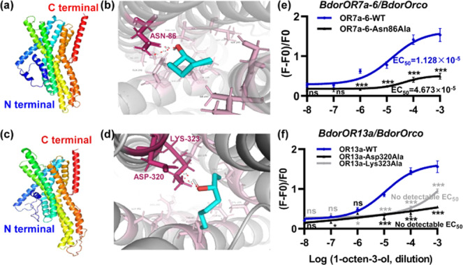 Fig. 5. Molecular docking of BdorOR7a-6 and BdorOR13a to 1-octen-3-ol, and site-directed mutagenesis to confirm the essential residues.a Structure of BdorOR7a-6 predicted using AlphaFold 2.0. b Residue of BdorOR7a-6 required for binding to 1-octen-3-ol. c Structure of BdorOR13a predicted using AlphaFold 2.0. d Residues of BdorOR13a required for binding to 1-octen-3-ol. e Response of BdorOR7a-6 Asn86Ala mutant to 1-octen-3-ol based on calcium imaging. f Responses of BdorOR13a Asp320Ala and Lys323Ala mutants to 1-octen-3-ol based on calcium imaging.