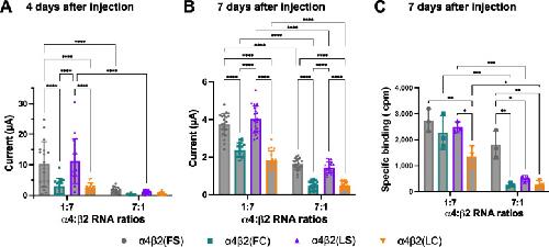 Fig. 3. Maximal ACh-induced current and labeling of Epipedobates anthonyi α4β2 nAChRs. Maximal ACh-induced currents were measured at 4 (A, n = 14–18 oocytes) and at 7 (B, n = 21) days after injection. The presence of cysteine in location 108, either combined with F106 [β2(FC), green] or with L106 [β2(LC), wild type, orange], decreases the magnitude of ACh-stimulated maximal currents through the α4β2 receptors, compared with β2(FS) (gray) and β2(LS) (violet). The bold font indicates a substitution introduced in the wild-type receptor. Following recordings shown in B, oocytes were treated with the radiolabeled antibody.125I-mAb 295 to quantify the specific binding, i.e., the number of β2-containing nAChRs expressed in the plasma membrane (C, n = 3, 7 pooled oocytes each experiment). Cpm stands for counts per minute. α4:β2 RNA injection ratios favoring HS (1:7) and LS (7:1) stoichiometries are indicated on the X-axis. Data are presented as means ± SD and were analyzed using two-way ANOVA, followed by pairwise comparisons corrected for multiple comparisons with Holm-Šídák’s test. *P < 0.05, **P < 0.01, ***P < 0.001, ****P < 0.0001