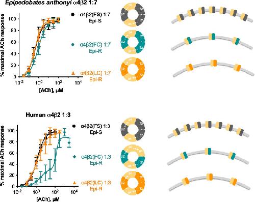 BACKGROUND: Some dendrobatid poison frogs sequester the toxin epibatidine as a defense against predators. We previously identified an amino acid substitution (S108C) at a highly conserved site in a nicotinic acetylcholine receptor β2 subunit of dendrobatid frogs that decreases sensitivity to epibatidine in the brain-expressing α4β2 receptor. Introduction of S108C to the orthologous high-sensitivity human receptor similarly decreased sensitivity to epibatidine but also decreased sensitivity to acetylcholine, a potential cost if this were to occur in dendrobatids. This decrease in the acetylcholine sensitivity manifested as a biphasic acetylcholine concentration-response curve consistent with the addition of low-sensitivity receptors. Surprisingly, the addition of the β2 S108C into the α4β2 receptor of the dendrobatid Epipedobates anthonyi did not change acetylcholine sensitivity, appearing cost-free. We proposed that toxin-bearing dendrobatids may have additional amino acid substitutions protecting their receptors from alterations in acetylcholine sensitivity. To test this, in the current study, we compared the dendrobatid receptor to its homologs from two non-dendrobatid frogs.