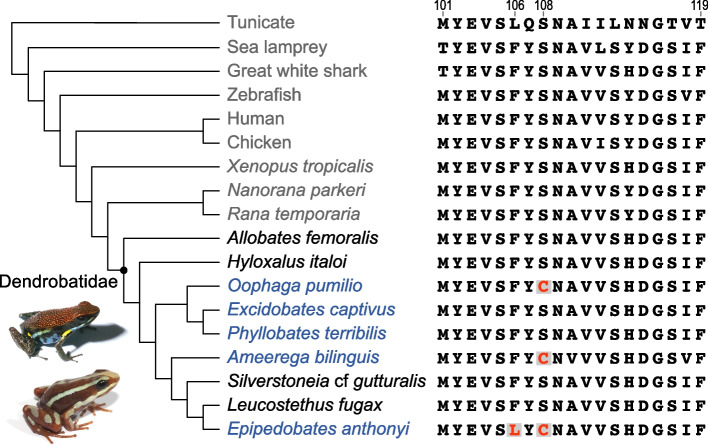 Fig. 1. Phylogeny of selected chordates showing the variation of amino acid sequences in the region of interest of the β2 nAChR subunit. Scientific names are used for the frogs. The dot in the phylogeny represents the ancestor of the poison frogs (Dendrobatidae clade). The names of undefended species of poison frogs are in black, and those of defended species are in blue. Defense by sequestered alkaloids appears to have evolved three times, associated with the parallel evolution of S108C and the unique evolution of F106L in Epipedobates. Accession numbers and names of the species included in this figure can be found in Additional file 3. Photos of Ameerega bilinguis and Epipedobates anthonyi (from which epibatidine was first isolated) are shown in the lower left. Photos courtesy of David Cannatella