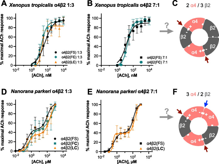 Fig. 2. Acetylcholine CRCs of receptors from two non-dendrobatid frogs. Xenopus tropicalis retain a monophasic ACh CRC best fit with a single EC50 (Table 1 and Additional file 4) even in conditions that induce LS sites in mammalian α4β2 nAChRs (7α:1β) or with the S108C substitution alone [β2(FC)] or in combination with F106L [β2(LC)]. The α:β RNA ratios are 1:3 (A, n = 6–18) and 7:1 (B, n = 13–37). The actual stoichiometry of frog receptors is unknown but the Xenopus α4β2 nAChR behaves as the mammalian 2α:3β stoichiometry (C). This conjecture is indicated as a question mark over the gray arrow. Note that the scale for Xenopus is nanomolar concentration. Nanorana parkeri retain a biphasic CRC best fit with two EC50 values (Table 2 and Additional file 4) in both 1:3 (D, n = 5–9) or 7:1 (E, n = 6–9) α:β RNA ratios, with the S108C substitution alone [β2(FC)] or in combination with F106L [β2(LC)]. The Nanorana α4β2 nAChR behaves as if its stoichiometry is 3α:2β (F) with both ratios of RNA used in this study. Data points represent means ± SD. Red arrows indicate HS-binding sites, and blue arrow indicates LS-binding site. + and − signs indicate the principal and complementary components of the subunit interfaces