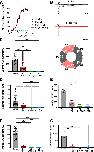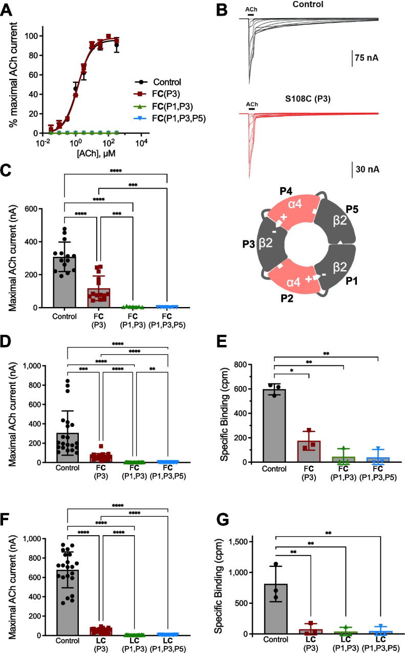 Fig. 4. Currents and number of receptors measured after the expression of concatenated human nAChRs. All concatemers have an enforced 2α:3β stoichiometry (indicated by the inset of the schematic receptor). A Wild-type receptor [F106 and S108, β2(FS), black] generates a CRC with a monophasic fit. A similar concentration–response profile was observed for concatenated α4β2 nAChRs with a S108C substitution (red, FC, substitution indicated by bold font; P3 = position 3 within the linked receptor) in a single β2 subunit. However, concatenated α4β2 nAChRs with two (green) or all three (blue) β2 subunits containing S108C in the indicated positions generate no current. CRC analysis can be found in Table 3 and Additional file 4, n = 7–14. B Raw current traces to increasing concentrations of ACh. C Concatemers where a single β2 subunit has a S108C substitution [β2(FC)] show significantly reduced currents. As stated in A, concatemers with two or three S108C-containing β2 subunits generate no current (n = 7–14). D We repeated the experiment shown in C and then measured the number of receptors in the plasma membrane in the same oocytes. Baseline recordings of maximal currents (n = 21). E Measurements of receptor number in the plasma membrane in oocytes from D (n = 3, 7 pooled oocytes in each experiment). F ACh-induced maximal currents in concatenated α4β2 nAChRs with an F106L substitution in addition to the S108C [β2(LC)] (n = 21). G Measurements of receptor number in the plasma membrane in oocytes from F (n = 3, 7 pooled oocytes in each experiment). The addition of F106L substitution to S108C [β2(LC)] did not rescue the effect of S108C. In both E and G, concatenated α4β2 nAChRs with a single S108C-containing β2 subunit have significantly reduced numbers of receptors in the plasma membrane when compared to controls. Those concatenated α4β2 nAChRs with two or three β2 subunits harboring the S108C mutation are not expressed in the plasma membrane (i.e., the values were no different from uninjected oocytes). Specific binding was measured as counts per minute (cpm). Data are shown as means ± SD and were analyzed using the Brown-Forsythe and Welch ANOVA tests, followed by Dunnett’s T3 multiple comparisons test. *P < 0.05, **P < 0.01, ***P < 0.001, ****P < 0.0001