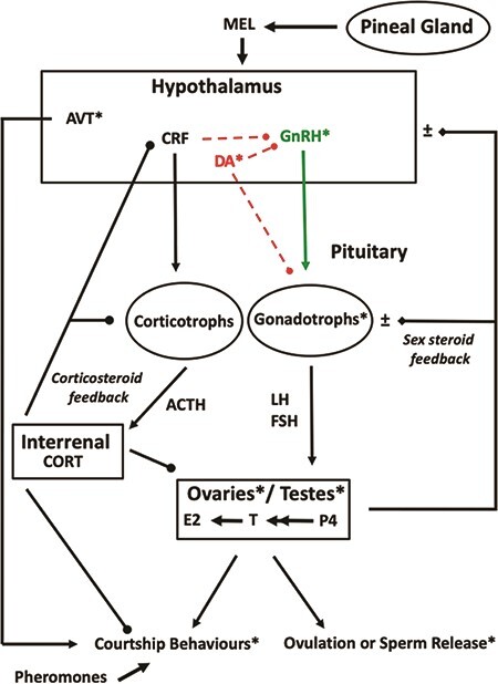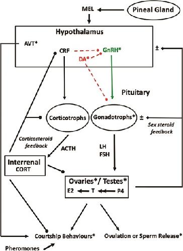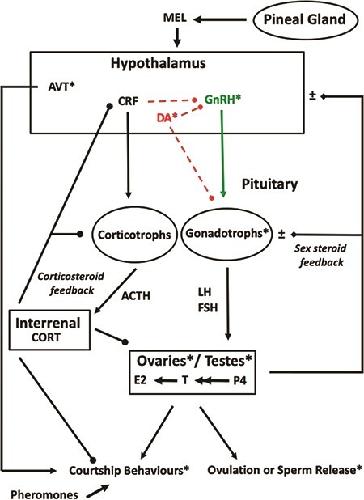 Dufour, Dopaminergic inhibition of reproduction in teleost fishes: ecophysiological and evolutionary implications. 2005, Pubmed