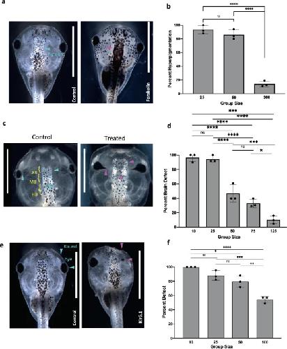 Fig. 2: Conspecific effect beyond thioridazine exposure. a Images of control (left) and forskolin-treated animals (right), demonstrating hyperpigmentation following forskolin exposure (purple arrows). b The graph shows the total frequency of hyperpigmentation in embryos exposed to forskolin in small (n = 25), medium (n = 50), and large (n = 300) groups. ****p < 0.001.. c Control animal raised in 0.1x MMR with normal brain structures (left). ****p <0.0001. Representative animals from cohorts subjected to nicotine treatment were then raised at a group size of 75 animals (right). Purple arrows highlight misshapen eyes, malformed forebrain, and midbrain. d Percent total of embryos with brain defects in groups treated with nicotine at densities of n = 10, 25, 50, 75, and 125. ****p < 0.0001, ***p = 0.0008, *p = 0.0197. e Effect of group size on incidence of defects in dominant-negative Kir6.1-injected embryos. Images of control (left) and injected (right) embryos at stage 45. Blue arrows indicate normal eyes and head shape while purple arrows point out misshapen heads and eyes. f Quantification of malformed and normal individuals at stage 45. Group size of n = 10, 25, 50, and 100. Both cells at the 2-cell stage were injected and embryos were split into different size groups post injection. *p = 0.0111, ****p < 0.0001, ***p = 0.0004, and **p = 0.0028. All animal images are dorsal views and oriented so anterior is facing up and dorsal is down. For all data: values are plotted as mean ± SD, one-way ANOVA, and Tukey tests were conducted. Each dot on the graph is a separate replicate. All treatments are normalized to the mean of non-treated controls’ spontaneous defects. Scale bars represent 2 mm. Source data are provided as a Source Data file. |