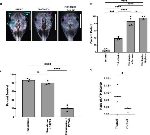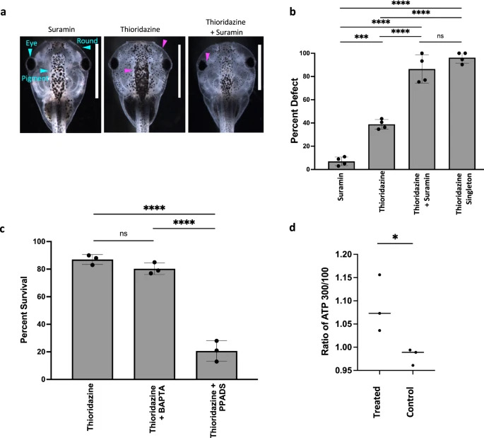 Fig. 7: ATP/P2X receptors may mediate CEMA. a Suramin eliminates the protective effect of large group size against thioridazine-induced craniofacial defects and death. Tadpoles in groups of 300 were treated with 100 µM suramin, 90 µM thioridazine, 90 µM thioridazine and 100 µM suramin together, and compared to 90 µM thioridazine exposure as singletons. Blue arrows showing normal eyes, pigmentation, and head shape. Purple arrows show defects in those regions. b Percent defect of each group (n = 300 for each group) was then quantified. ****p < 0.0001 and ***p = 0.0002. c Thioridazine concentration was constant at 90 µM across all treatments and calcium or P2 receptor blockers were added. Calcium was depleted using 5 µM BAPTA. P2 receptors were inhibited with 100 µM PPADS. Each treatment group had a total of n = 300 embryos. ****p < 0.0001. d Quantification of extracellular ATP concentration. *p = 0.0443. Each dot represents the average of a group of three replicates. All animal images are dorsal views, and are oriented with the anterior end at the top of the image. For all data: values are plotted as mean ± SD, one-way ANOVA, and Tukey tests were conducted, and ***p ≤ 0.001, **p ≤ 0.01, *p ≤ 0.05. All treatments are normalized to the mean of non-treated controls’ spontaneous defects. Scale bars represent 2 mm. Source data are provided as a Source Data file. |