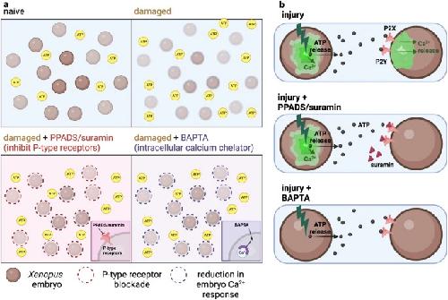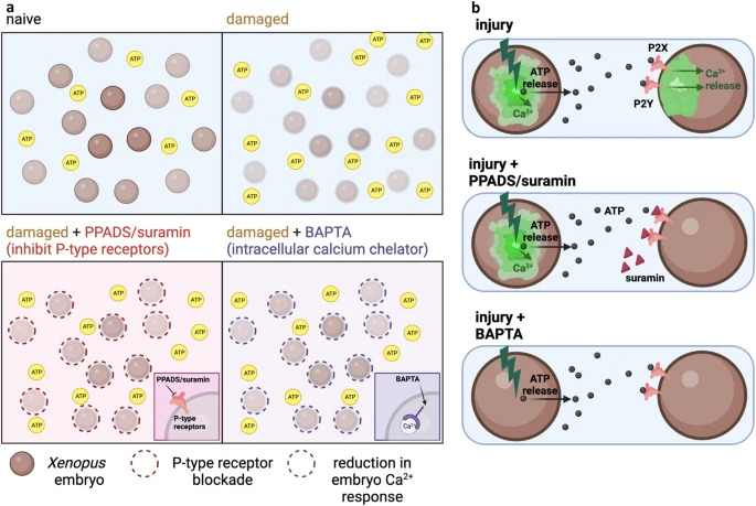Fig. 9: Mechanistic model of CEMA effects. a Naive condition in which embryos are undisturbed. Damaged conditions in which embryos are subjected to injury and ATP expulsion increases. Damaged embryo + PPADS/Suramin showing the environment in which P-type receptors are blocked and inhibiting the binding of ATP. Damaged + BAPTA shows that internal calcium stores are depleted and there is a reduction of calcium response. b Enlarged view of internal events during injury. Top: The embryo on the left is injured and elicits a calcium response and increased ATP release. ATP binds to P2X receptors on neighboring, uninjured embryos and elicits its own calcium response. Middle: In the presence of PPADS/Suramin, the injured embryo has a calcium and ATP response but P2X receptor blockade prevents ATP binding and subsequent calcium wave in the uninjured embryo. Bottom: In the presence of BAPTA, the injured embryo no longer has a calcium response, but is still able to increase the release of ATP. ATP can still bind to P2X receptors in the neighboring embryo but there is no calcium wave, indicating that the calcium responses in both the injured and uninjured neighbor are dependent on calcium. Created with BioRender.com. |
