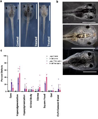 Supplemental Figure 1. Additional images of thioridazine treated tadpoles and additional noted defects. (A) Whole body images of thioridazine treated animals. (B) Variations in square head phenotypes. (C) Quantification of all observed defects from thioridazine treatment in large and small groups with their respective controls. |