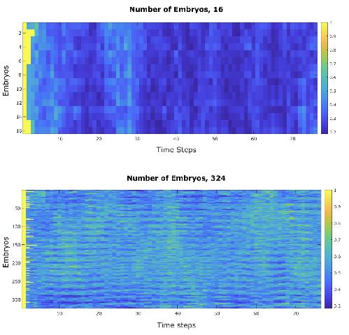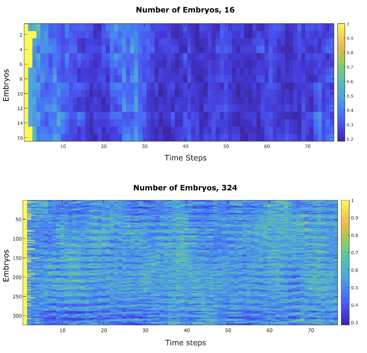 Supplemental Figure 4. Two representative examples of health values over time. In each graph, the y-axis is embryos in the group and the x-axis is time. At each time point the health value of the embryo is reported as a color (yellow is more health and blue is more unhealthy). For low numbers of total embryos, health values quickly collapse to low values. This can be seen in the top graph as the colors slowly drift to a dark blue color. Conversely, under the same conditions, large numbers of embryos better resist noise, resulting in healthy, although not perfectly healthy, embryos. This can be visually seen in the lower graph, where the health values are more yellow than the upper graph, meaning higher health. While not a central area of investigation for this study, it is particularly interesting how health and noise balance one another. |