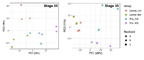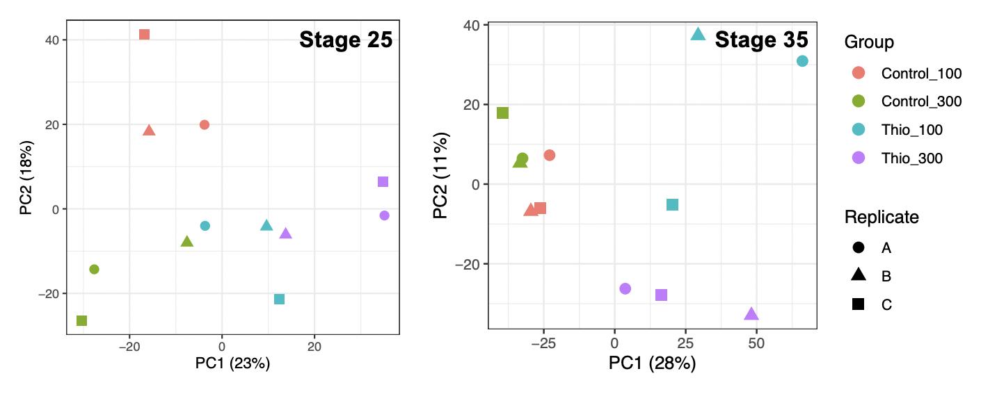 Supplemental Figure 6. Principal component analysis of RNA-sequencing data for Stage 25 and Stage 35 Xenopus housed in small (100-embryo) and large (300-embryo) group sizes in control or thioridazine-treated media. |