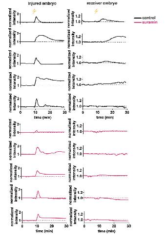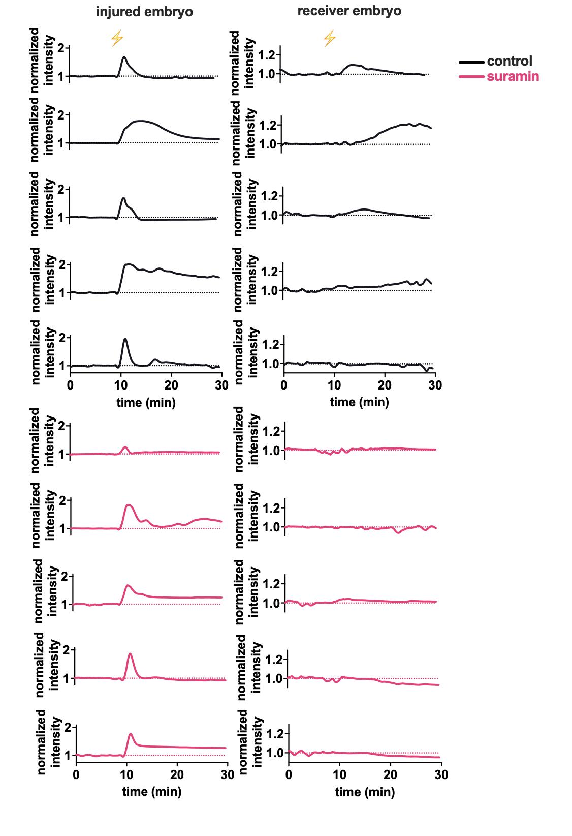 Supplemental Figure 7. Intensity vs. time plots for control and suramin-treated embryos. Baseline (0-10 minutes) and post-injury (10- 30 mins) traces are shown for the injured and receiver embryos. The time point of injury is denoted by the lightning bolt. |