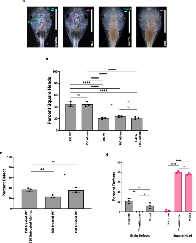 Fig. 3: Genetically diverse populations can also benefit from CEMA but unperturbed cohort members do not aid in stabilization. a Examples of wildtype and albino animals that were untreated (controls) or treated with thioridazine (treated). Blue arrows highlight normal head shape and pigmentation. Purple arrows indicate square heads and hyperpigmentation. b Percent total of embryos with square heads in two strains of Xenopus laevis, wildtype (either n = 150 or n = 300, respectively labeled on the graph) and albino (n = 150 or n = 300, respectively labeled on the graph). ****p < 0.0001. c Averages of the frequency of square head defects in a mixed group of n = 150 thioridazine-treated wildtype embryos + 150 untreated albinos, n = 300 treated wild-type embryos, and n = 150 treated wild-type embryos. **p = 0.0094 and *p = 0.0133. d Average of the frequency of brain defects and square heads in nicotine, thioridazine, and mixed treatments (n = 150 in each group). **p = 0.0019 and *p = 0.0291 for brain defects and ****p < 0.0001 for square head. All animal images are dorsal views with the anterior end at the top of the image. For all data: values are plotted as mean ± SD, one-way ANOVA, and Tukey test were conducted. All treatments are normalized to the mean of non-treated controls’ spontaneous defects. Scale bars represent 2 mm. Source data are provided as a Source Data file. |
