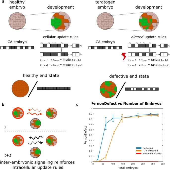 Fig. 4: Computational agent-based model of CEMA. a Cartoon example of healthy and teratogen-influenced development. Left, an ECA, a 1D array of 0's and 1's, has an initial configuration of 40% 0's (white) and 60% 1's (black). ECA follows the GKL update rule, solving the majority problem by converging to all 1's. Right, an ECA that has noise induced by teratogens, which does not successfully solve the majority problem. b A cartoon example of inter-embryonic signaling from time t to time t + 1. Embryos signal their current health (red) at time t and supportive signals (black) at the next timestep to their neighbors and nearest neighbors. Embryos that have not been exposed to the teratogen cannot participate. c Data from the simulation shows that inter-embryonic signaling, CEMA, aids in development in the presence of noise (blue line). Without this communication, development fails in the presence of noise (red line). When half of a cohort is comprised of untreated embryos, they do not participate, and therefore the effect is lower (orange line). Each experiment included the number of embryos equal to the total embryos indicated on the x-axis and each experiment was repeated 50 times. The bars on the graph are 95% confidence intervals and the center represents the mean. Source data are provided as a Source Data file. |