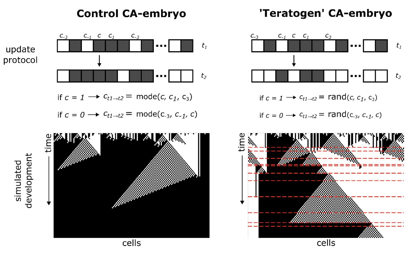 Supplemental Figure 3. A visual example of how the control and ‘teratogenexposed’ ECAs update from one time step to another. (Left) Normally, cells follow the GKL rule 84, successfully solving the majority problem. There is an initial distribution of ones (black) and zeros (white) with more ones than zeros. The ECA evolves (top to bottom) and converges to all ones. (Right) In the presence of noise (red dashed line), the rules shift (and stay shifted) to random updating, and the ECA fails to solve the majority problem. There is the same majority in the right as in the left, but at the end of the simulation not all cells are one/black. These examples were generated as singletons, and no collective effects are shown here. |