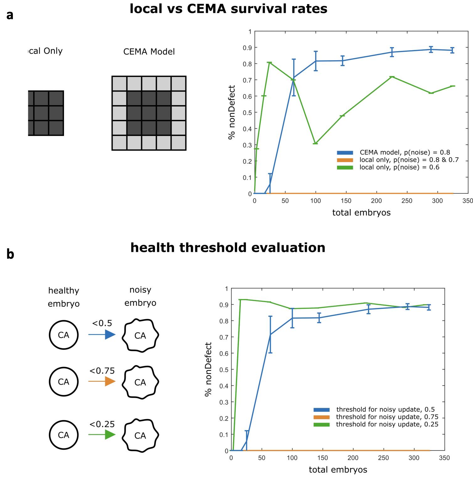 Supplemental Figure 5. (A) Left, a schematic of two tested conditions – first with only neighbor’s interactions involved in the simulations and second with neighbor’s neighbors’ involved. Right, a graph showing how these two conditions (orange and blue, respectively) effect how the cohort resists noise. Even when lowering noise (green), small, local-only interactions are not enough to resist noise. (B) Left, a schematic showing how health threshold values were tested. Right, a graph showing how these three conditions altered the simulations while keeping all other parameters set |