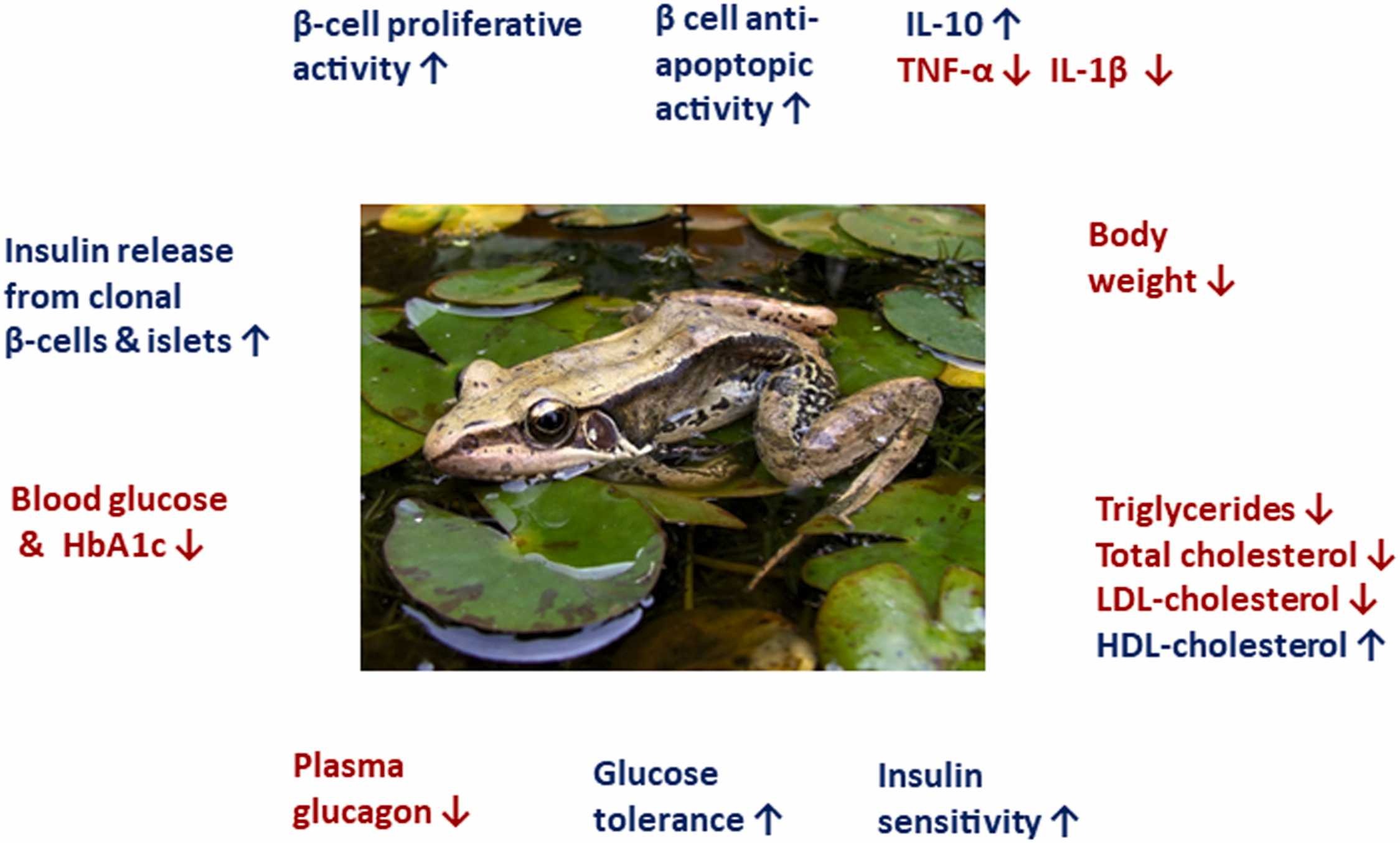 Investigations conducted since 2018 have identified several host-defense peptides present in frog skin secretions whose properties suggest the possibility of their development into a new class of agent for Type 2 diabetes (T2D) therapy. Studies in vitro have described peptides that (a) stimulate insulin release from BRIN-BD11 clonal β-cells and isolated mouse islets, (b) display β-cell proliferative activity and protect against cytokine-mediated apoptosis and (c) stimulate production of the anti-inflammatory cytokine IL-10 and inhibit production of the pro-inflammatory cytokines TNF-α and IL-1β. Rhinophrynin-27, phylloseptin-3.2TR and temporin F are peptides with therapeutic potential. Studies in vivo carried out in db/db and high fat-fed mice have shown that twice-daily administration of [S4K]CPF-AM1 and [A14K]PGLa-AM1, analogs of peptides first isolated from the octoploid frog Xenopus amieti, over 28 days lowers circulating glucose and HbA1c concentrations, increases insulin sensitivity and improves glucose tolerance and lipid profile. Peptide treatment produced potentially beneficial changes in the expression of skeletal muscle genes involved in insulin signaling and islet genes involved in insulin secretion in these murine models of T2D. Lead compounds uncovered by the study of frog HDPs may provide a basis for the design of new types of agents that can be used, alone or in combination with existing therapies, for the treatment of T2D.