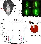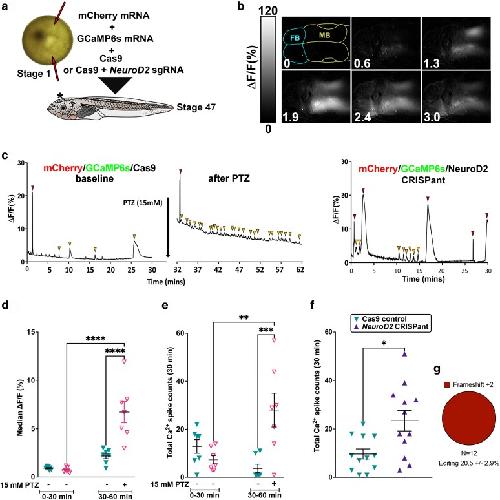 NeuroD2 CRISPant tadpoles show strong, prolongued, and widespread Ca2+ signals in the brain. a) Experimental design. Fertilized X. laevis embryos at the one cell stage were injected twice (red arrows) on either side of the female nucleus (light spot), avoiding the ventrally located sperm entry point (dark spot). mCherry mRNA was used to confirm injection, GCaMP6s mRNA encodes a Ca2+-sensing fusion protein that can detect action potentials, emitting strong fluorescence in the GFP channel signals (Li et al. 2022). Controls were only injected with Cas9 protein, and CRISPant embryos were injected with Cas9 with NeuroD2 sgRNA rnk20 loaded. Embryos were raised to stage 47. b) Example still frames taken every 0.64minutes from a live NeuroD2 CRISPant tadpole brain (TILLvisION 4.0). GCaMP6s fluorescence (lighter colour = higher intensity) can be seen across large regions of the brain. Scale bar indicates Ca2+ signal intensity (%). Forebrain (FB) hemispheres outlined in blue, midbrain (MB) in yellow, hindbrain in pink is mostly out of shot. Time in minutes is indicated in the bottom left. c) Examples of Ca2+ signals in the midbrain optic tectum (MFI across 30minutes), in control, PTZ-induced wild type tadpoles and NeuroD2 CRISPants. Note that the PTZ-induced Ca2+ signals are relative to baseline activity (before PTZ application). Red arrowheads indicate large spikes and gold arrowheads small spikes. (df) Scatterplots showing individual tadpoles as triangles, horizontal bars are means and error bars show SEM. d) Median midbrain Ca2 + signals in two groups of N = 7 Cas9 control tadpoles. One group was exposed to 15mM PTZ to induce seizure activity in the second recording time window (3060minutes). 2-way ANOVA, post hoc test of all means (uncorrected Fisher's LSD) ****P < 0.0001 e) Comparison of total (large and small) Ca2+ spikes in the same tadpoles and groups as in panel d, 2-way ANOVA, **P < 0.01, ***P < 0.001. f) Comparison of total Ca2+ spikes in Cas9 control tadpoles vs NeuroD2 CRISPants (N = 12) MannWhitney Test *P < 0.05). g) Summary of editing types detected by TIDE in the NeuroD2 CRISPant tadpoles used to generate these data. Trace data for all tadpoles in the study can be found in Supplementary Fig. 3 in Supplementary File 2, raw data and statistics in Supplementary File 1.