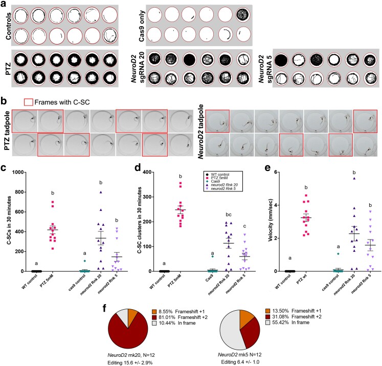 Fig. 2. CRISPR/Cas9 editing of NeuroD2 in tadpoles results in increased activity and C-SC of the tail. a) Tracks showing swimming trajectories of 12 individual tadpoles in wells of a 24-well plate (indicated by red circles), recorded over 30minutes. b) 14 consecutive video frames from example tadpoles, each frame is 40 msec apart. Frames where the tadpole is undergoing a C-SC of the tail are outlined in red. Left: wild type tadpole treated with 5mM PTZ to evoke acute C-SC; right: NeuroD2 CRISPant tadpole with spontaneous C-SC. ce) Scatter plots of behavioral data from groups of 12 tadpoles, analysed from 30minutes of video data at 25 frames per second. KruskalWallis statistical analysis with Dunn's post hoc testing of all means. Treatment groups that share the same lower-case letter are not significantly different, legend in d applies to all graphs. c) Manually counted C-SC frames from 30minute video recordings, d) Manually counted clusters of C-SC seizures e) Mean velocity (mm/sec). f) Summary of editing types detected by TIDE in the NeuroD2 CRISPant tadpoles used to generate these data. Raw count data and statistical analyses can be found in Supplementary File 1.