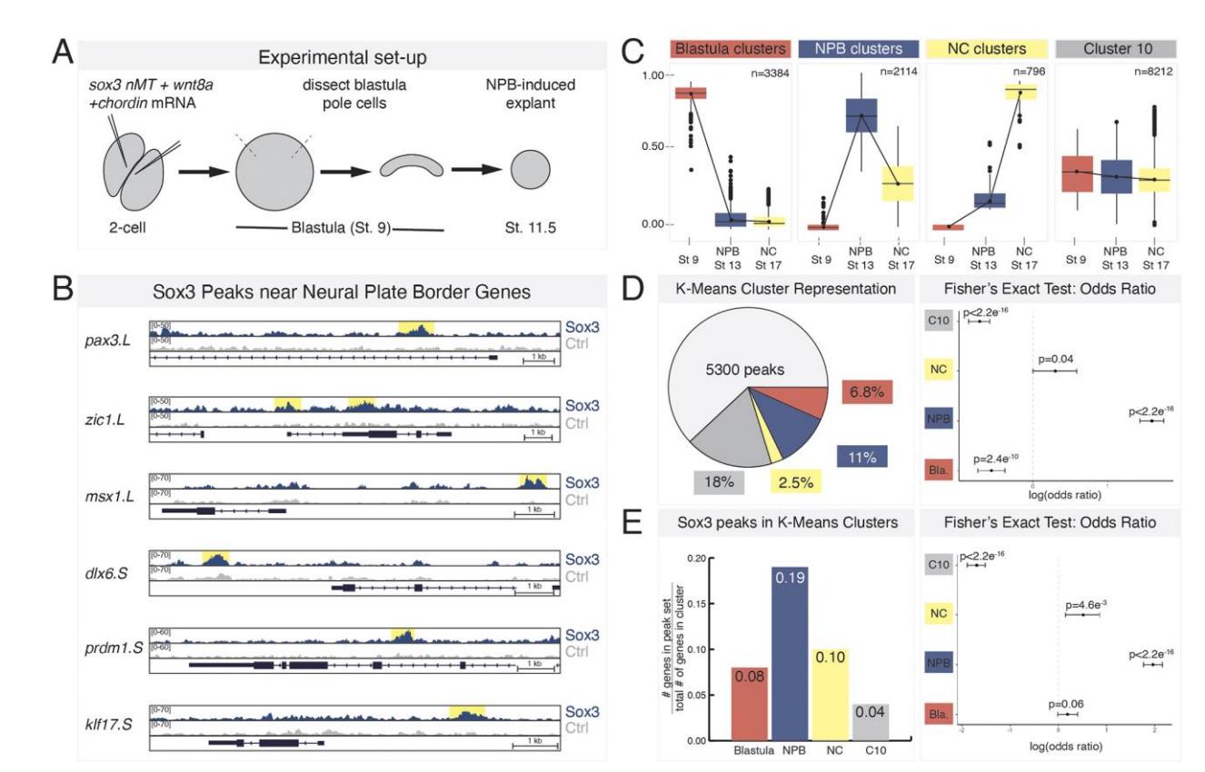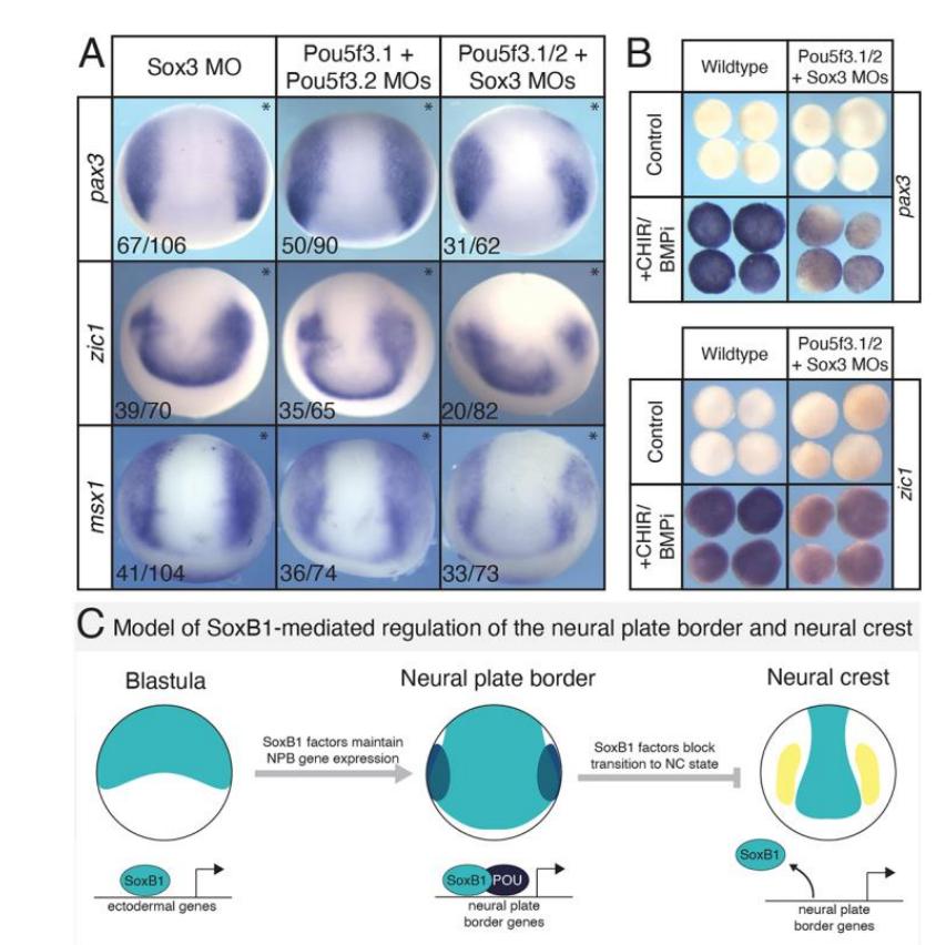 SoxB1 transcription factors (Sox2/3) are well known for their role in early neural fate specification in the embryo, but little is known about functional roles for SoxB1 factors in non-neural ectodermal cell types, such as the neural plate border (NPB). Using Xenopus laevis, we set out to determine if SoxB1 transcription factors have a regulatory function in NPB formation. Herein, we show that SoxB1 factors are necessary for NPB formation, and that prolonged SoxB1 factor activity blocks the transition from a NPB to a neural crest state. Using ChIP-seq we demonstrate that Sox3 is enriched upstream of NPB genes in early NPB cells and in blastula stem cells. Depletion of SoxB1 factors in blastula stem cells results in downregulation of NPB genes. Finally, we identify Pou5f3 factors as potential Sox3 partners in regulating the formation of the NPB and show their combined activity is needed for normal NPB gene expression. Together, these data identify a novel role for SoxB1 factors in the establishment and maintenance of the NPB, in part through partnership with Pou5f3 factors.