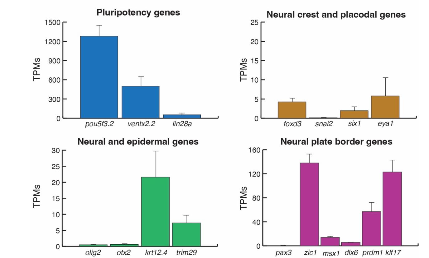 Genes referenced: dlx5 dlx6 foxd3 foxi2 gapdh klf17 lin28a msx1 myc npb odc1 olig2 pax3 pax7 pou5f3 pou5f3.2 pou5f3.3 prdm1 psmd6 six1 snai2 sox10 sox2 sox3 tfap2a ubc ventx2.2 zic1