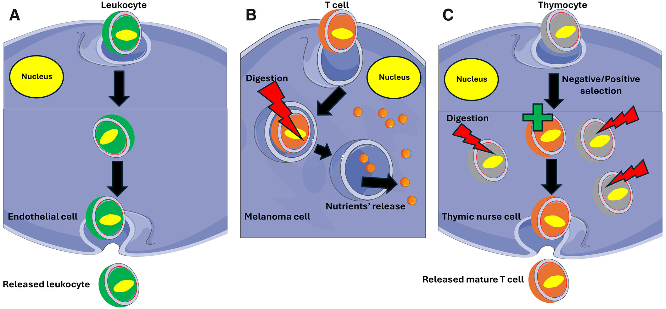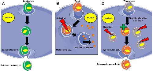 Cell-in-cell structures can be short-lived (A, B) or longer-lasting (C). (A) Leukocyte passage through the endothelium when the engulfed leukocyte remains in the endothelial cell for a short time before being released on the other side of the endothelial barrier. (B) A T cell ingested by a melanoma cell. After a short time, the T cell is digested through the lysosome pathway, and released nutrients nourish the host cell. (C) A longer-lasting cell-in-cell structure when thymocytes are engulfed by the thymic nurse cell that not only nourishes them, but also performs negative/positive selection releasing mature, antigen-specific, self-tolerant T cells. Thymic nurse cells are epithelial cells that express MHC Class I and MHC Class II antigens. The interaction of these antigens with the developing thymocytes determines whether the thymocyte undergoes positive or negative selection. Thymocytes expressing T cell receptors (TCR) with affinity to MHC class I and II molecules are positively selected while those expressing potentially harmful TCR are deactivated and destroyed (negative selection) by the lysosomal pathway.