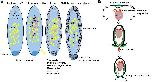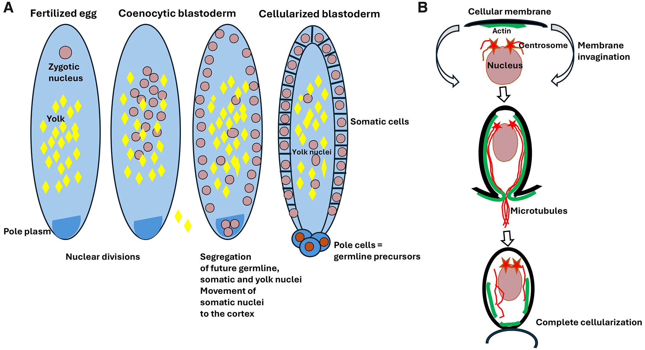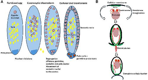 (A) After egg fertilization, the zygotic nucleus divides producing a population of nuclei within the common eggcytoplasm forming the coenocytic (syncytial) blastoderm. In the next step, some of the nuclei migrate to the eggposterior pole where the pole plasm containing germ cell determinants is located. These nuclei will eventually form the pole cells, which are the precursor of future germline. Most somatic nuclei move to the cell cortex where they eventually cellularize. Some of the somatic nuclei remain in the yolky center part of the egg as the yolk nuclei, which become polyploid, but their exact function remains unknown. (B) Blastoderm cellularization starts from the nucleus moving to the cortical, yolkless layer of cytoplasm. Once there, nucleus and its associated centrosomes induce the formation of under-membrane actin cup, which is followed by the elongation of aster microtubules, invagination of cellular membrane, and redistribution of actin along the membrane. Eventually, the cellular membrane completely encloses the nucleus and separates cell at the blastoderm surface.