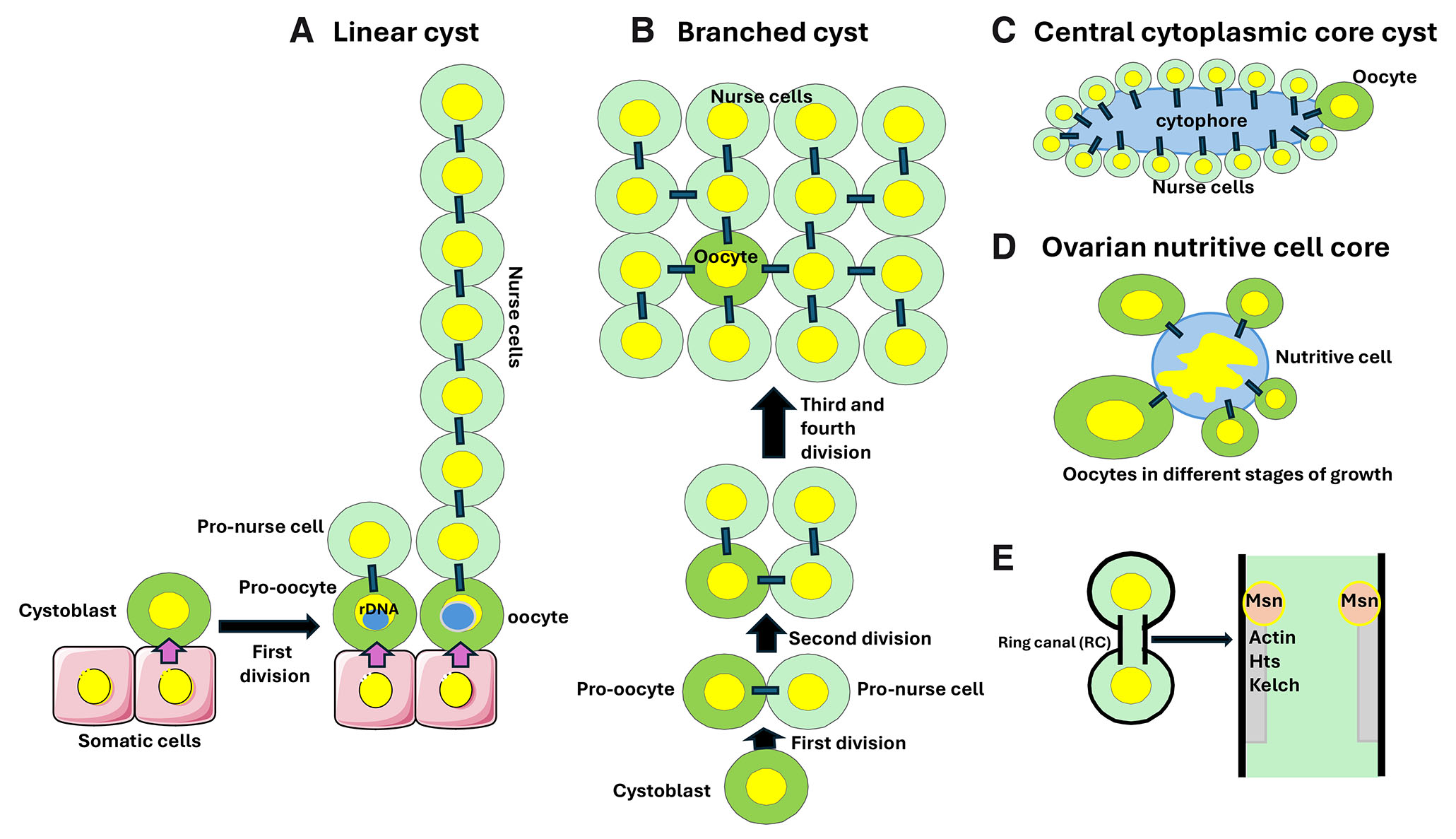 (A) The linear cysts form during development of the telotrophic ovaries in the rove beetle Creophilus maxillosus. The first division of the cystoblast produces two cystocytes connected by a ring canal (RC; marked by a black rectangle): the pro-oocyte, always remaining in contact with the somatic cell, and the pro-nurse cell. Next, several synchronous divisions produce a chain of cells connected by RCs. In each chain of sibling cells, the pro-oocyte is always located at the top of somatic cells. The, so far, unidentified signal emanating from somatic cells induces ribosomal DNA amplification, resulting in a large rDNA body (marked by a blue sphere) in the pro-oocytenucleus. The pro-oocyte becomes the oocyte and the remaining cystocytes undergo endoreplication and become the nurse cells. At each division, the rDNA body always segregates to the pro-oocyte. For a detailed description of Creophilus oogenesis see Kloc (2019). (B) The branched cystocyst in Drosophila. In the 16-cell cyst, only the two oldest cystocytes have four RCs each. One of these cystocytes becomes the oocyte, while the remaining cystocytes endoreplicate and become nurse cells. (C) In the annelid worm Enchytraeus albidus, a female germline cyst contains 15 nurse cells and one oocyte, all connected by individual RCs to the anuclear island of cytoplasm, the cytophore. (D) In some arachnids, the germline cyst contains the growing oocytes connected by the individual RCs to a centrally located large nurse cell with a large and branched nucleus. (E) The RCs are stabilized intercellular bridges derived from incomplete cytokinesis of cystocytes. Drosophila RCs contain various proteins such as actin, Hts, and Kelch, and their size is regulated by the Msn kinase.